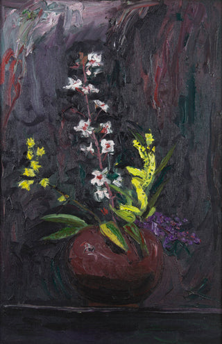 Rick Amor is among Australia’s most collectible artists. Best known for his psychologically incisive landscapes and atmospheric scenes of everyday life, Amor’s 1984 oil painting ‘Bush Flowers’ signals a departure from his signature architectural focus. Using rich tonal variation and layered brushwork, this still life painting is emotionally evocative, a testament to Amor’s ability to transform a classical subject with his distinct artistic voice.