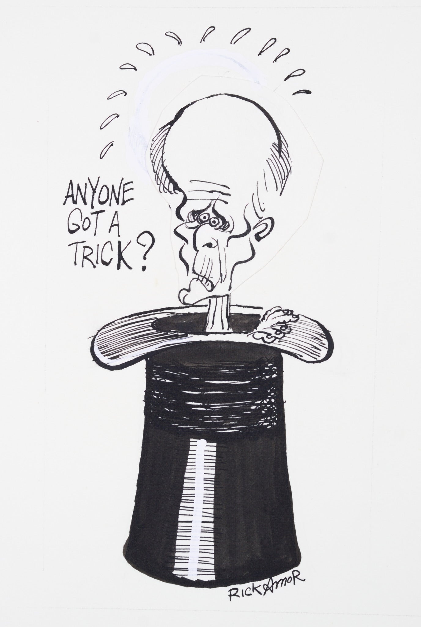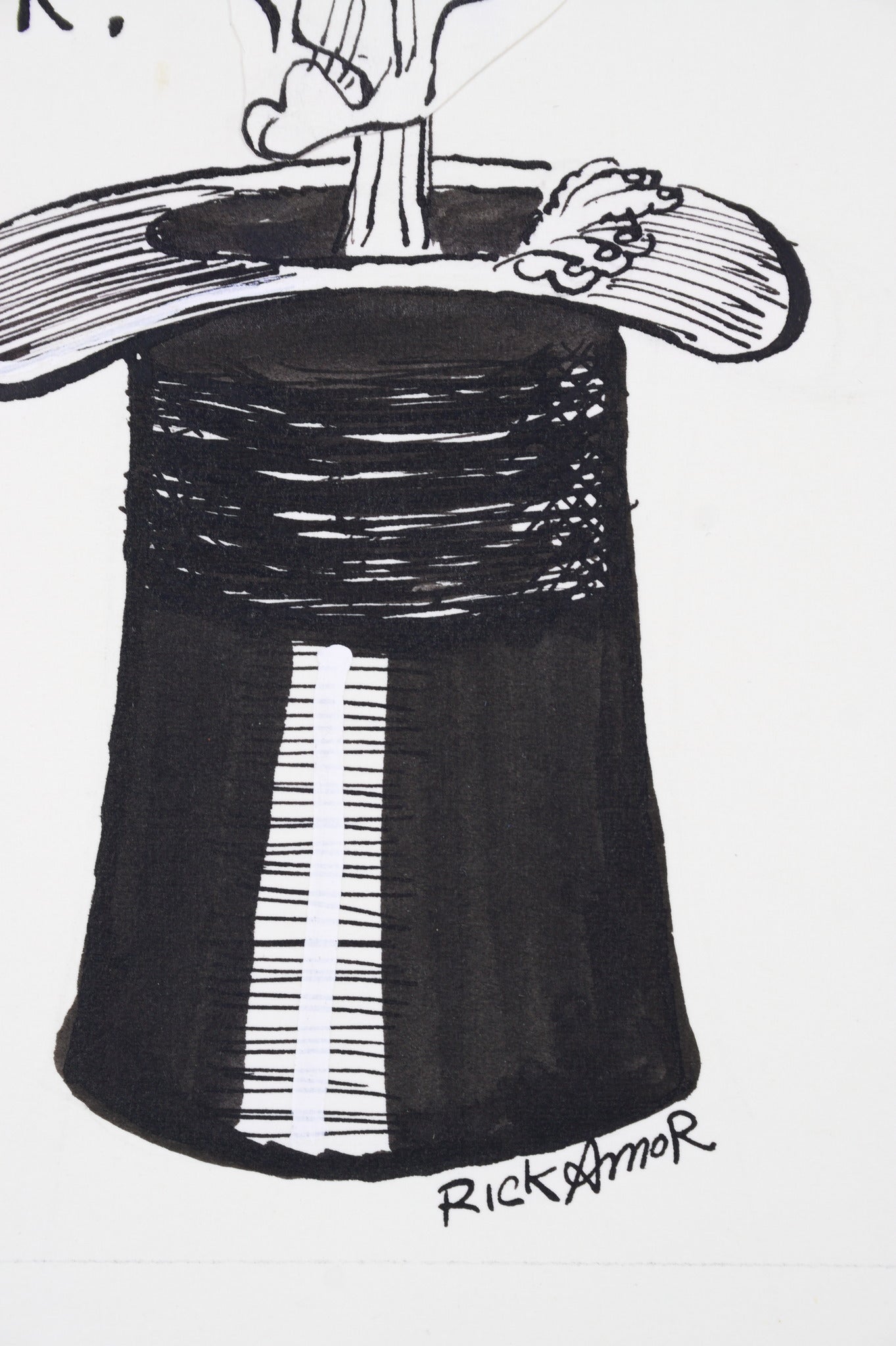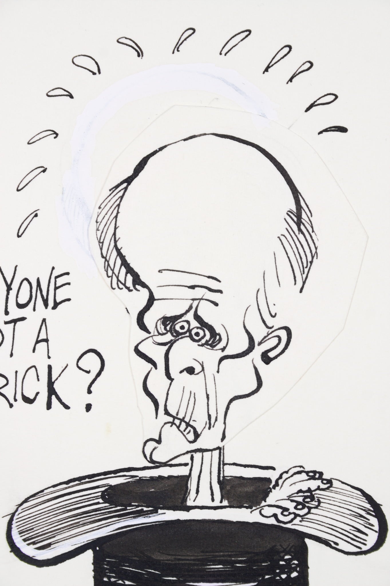 In 'Untitled (Anyone got a trick?)', Amor responds directly and unapologetically to the political events of the period. Rather than offering sober reportage, Amor turns to satire. Through exaggerated caricatures, absurd scenes, and comedic text, Amor creates cartoons that are bitingly witty and darkly humorous. The result is a scene that exemplifies the artist’s ability to merge comedy with critique.