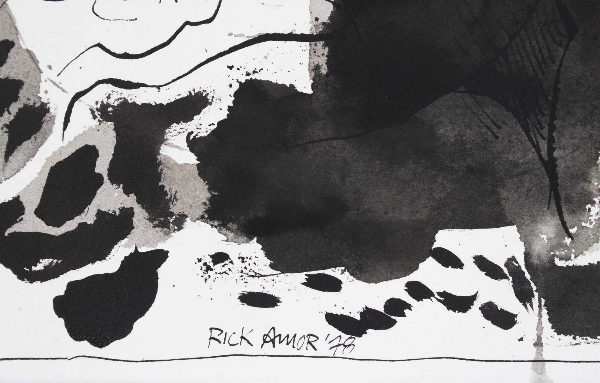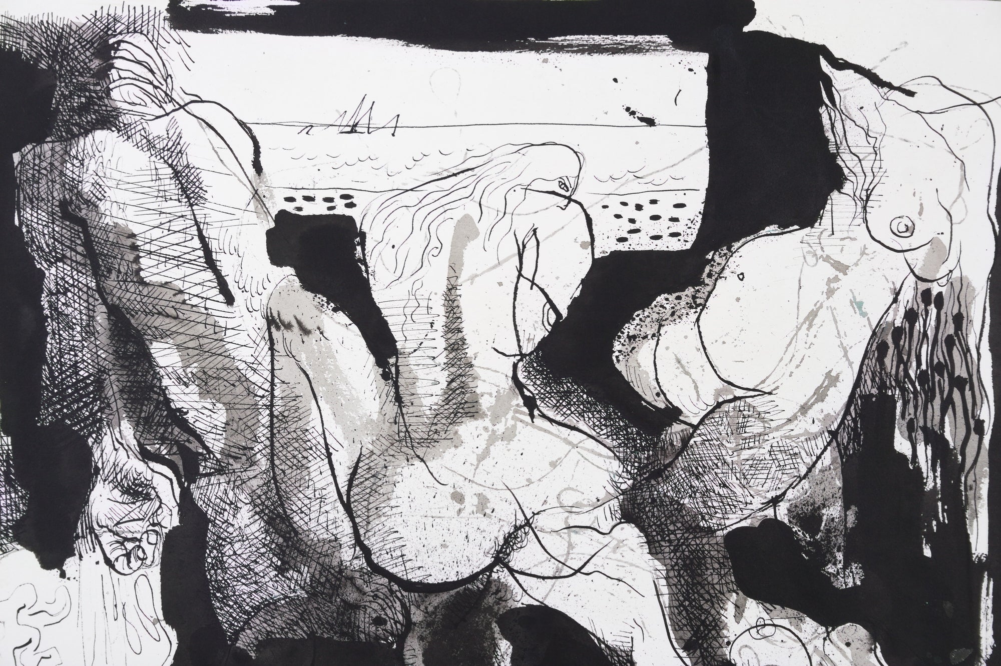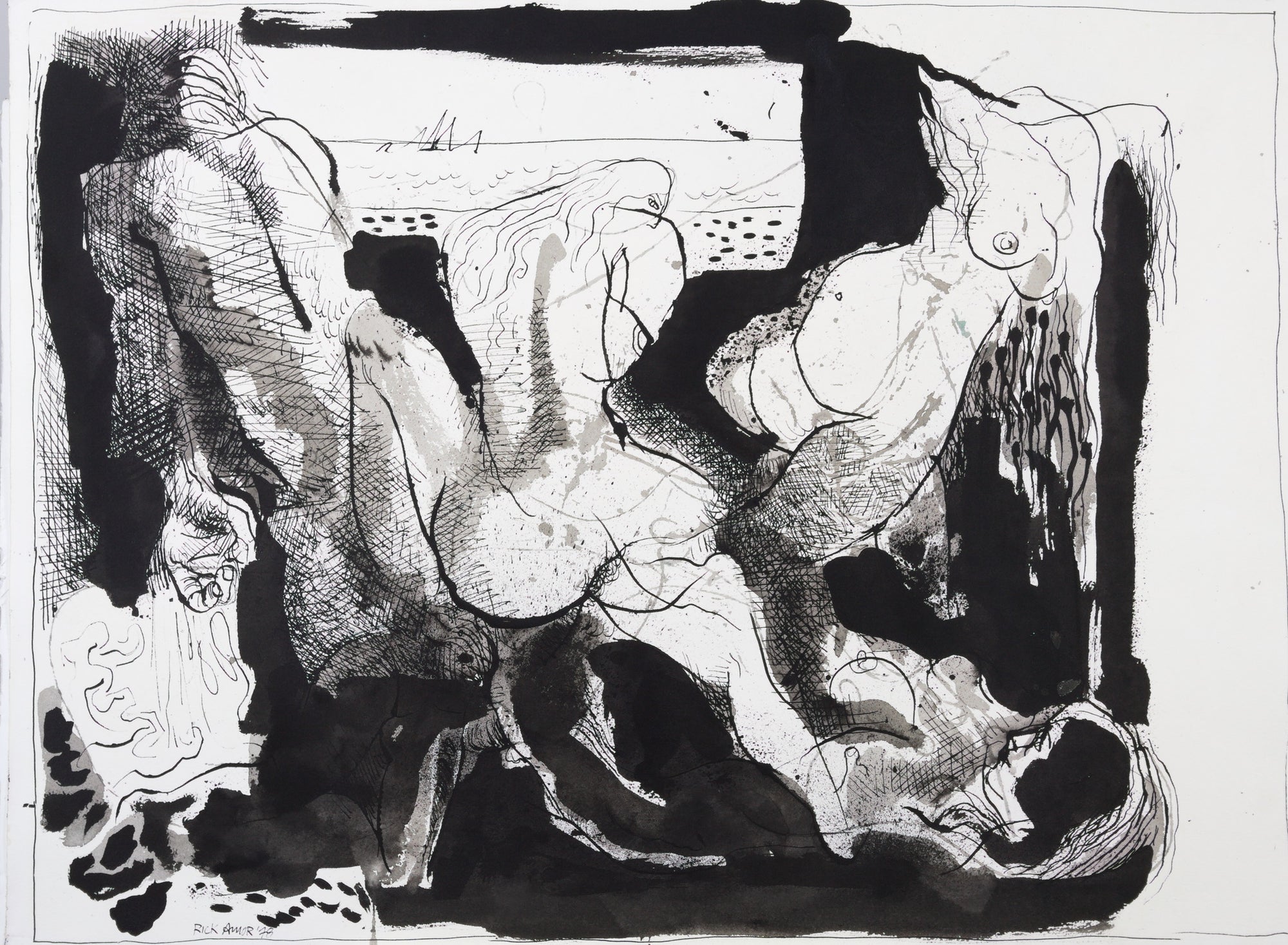 Rick Amor is among Australia’s most collectible artists. Best known for his psychologically incisive landscapes and atmospheric scenes of everyday life, Amor’s 1978 work on paper ‘Untitled (Figures)’ signals a departure from his signature architectural focus. In this work, Amor uses ink to create lyrical, fluid female forms, layering fragmented bodies atop one another. Blending figurative representation with expressionist sensibilities, Amor creates an ambiguous landscape populated by sudden, sensual glimpses of the human body.