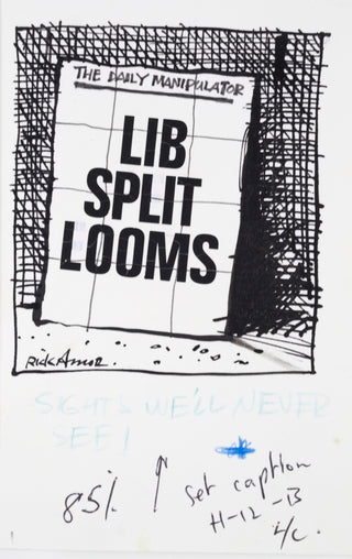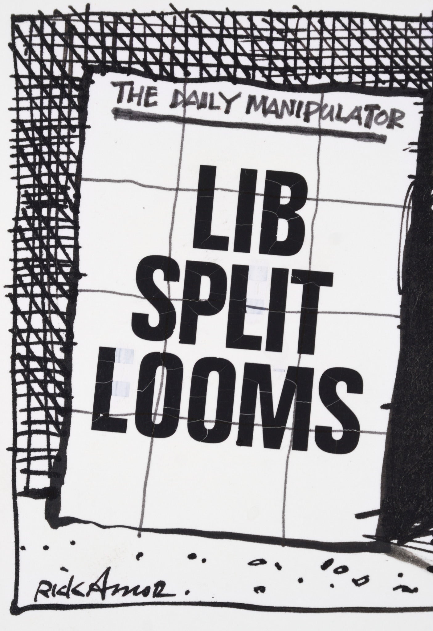 In 'Untitled (Lib Split Looms)', Amor responds directly and unapologetically to the political events of the period. Rather than offering sober reportage, Amor turns to satire. Through exaggerated caricatures, absurd scenes, and comedic text, Amor creates cartoons that are bitingly witty and darkly humorous. The result is a scene that exemplifies the artist’s ability to merge comedy with critique.