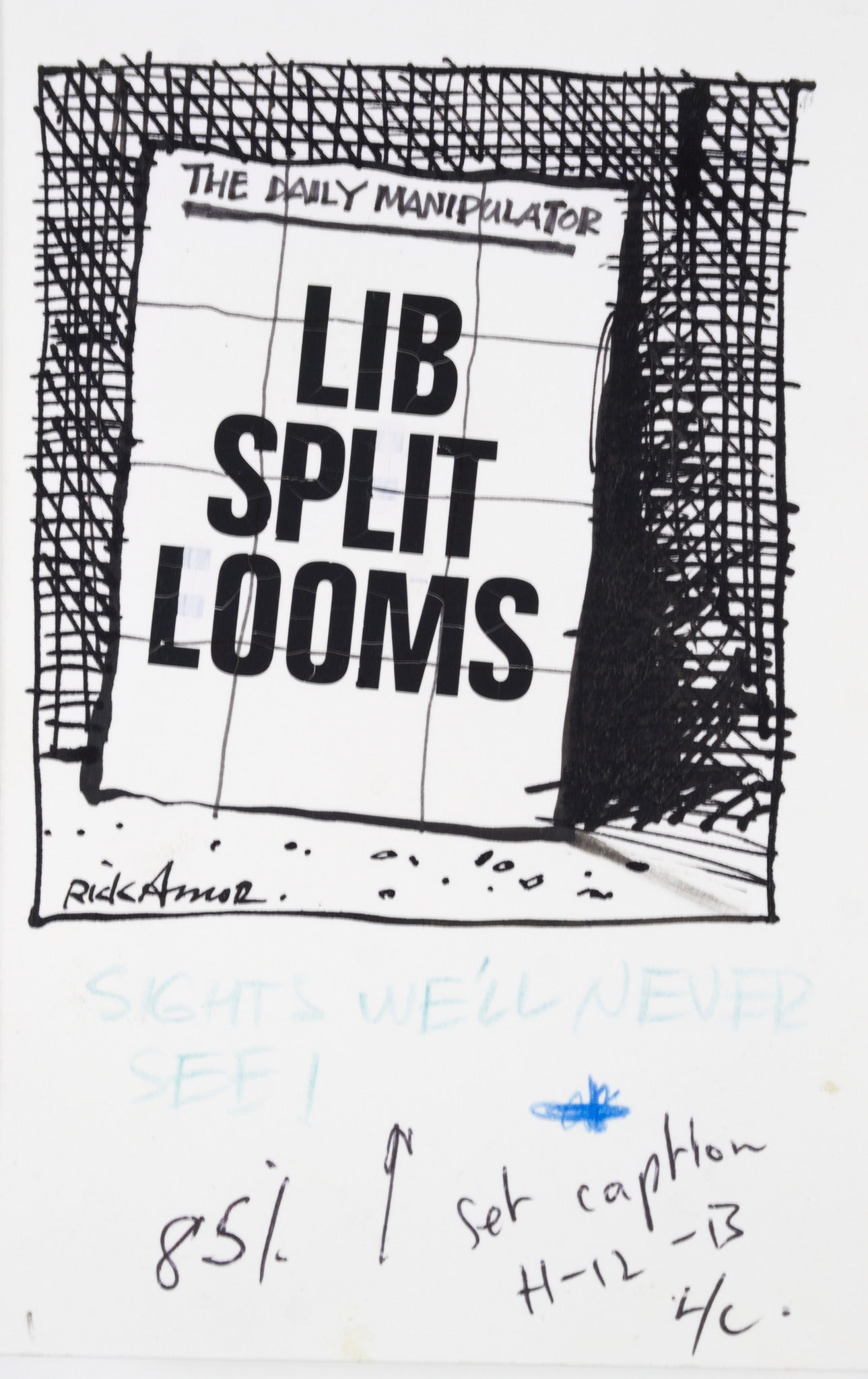 Rick Amor is among Australia’s most collectible artists. Best known for his psychologically incisive landscapes and atmospheric scenes of everyday life, Amor found his artistic beginnings in the world of political cartoons, working for several publications including ‘Overland’, where he was on the board until 1998. Working in this industry, Amor created hand-drawn works that were incisively political - sparking conversation, and responding directly, and honestly, to the world around him. These political cartoons are striking reflections of the diversity of Amor’s artistic skill.