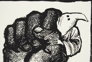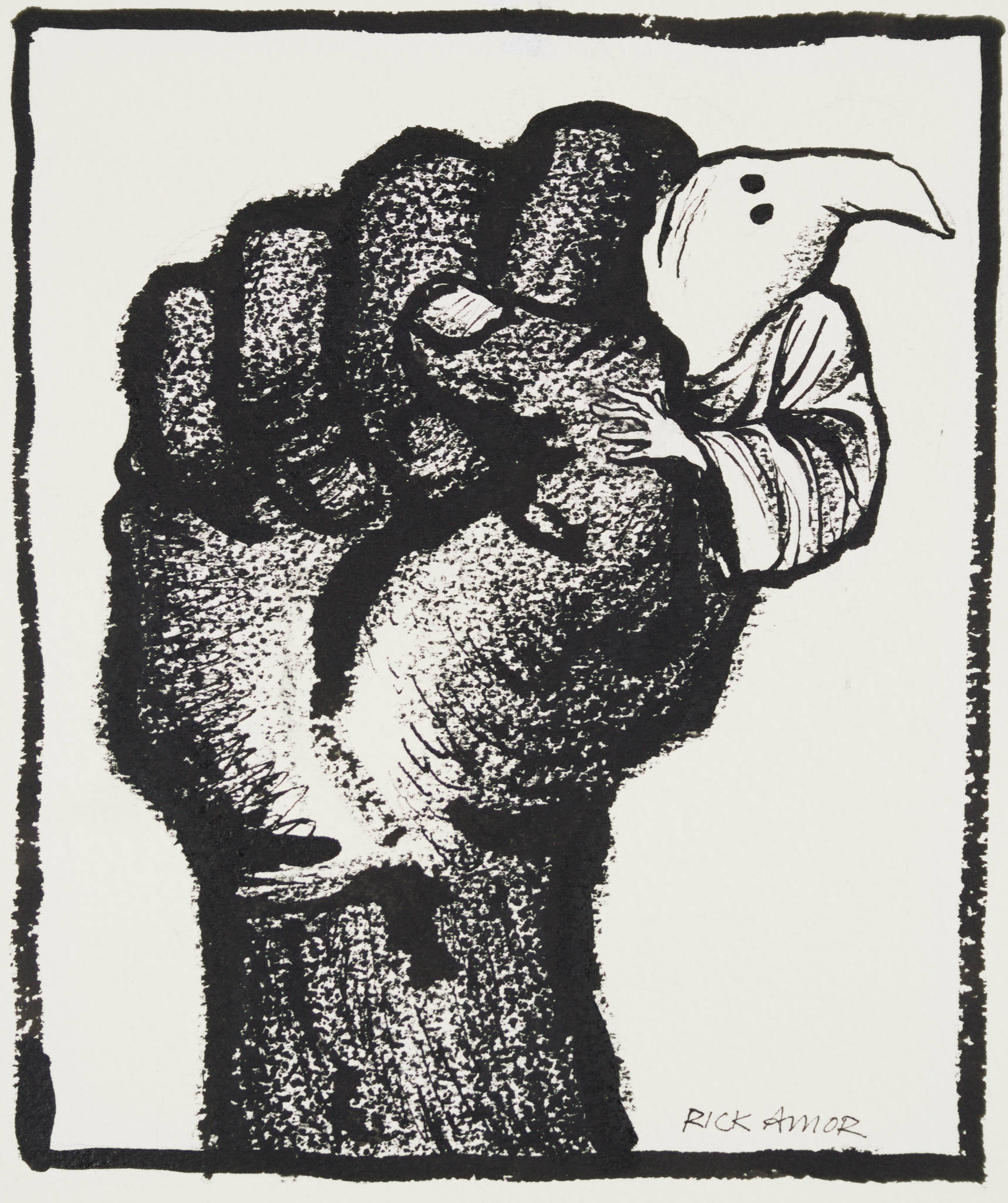 In 'Raised Fist' the artist uses the widely-recognised symbol of the raised fist as a sign of resistance, solidarity and defiance against oppression. Held tightly in this fist is a hooded figure, most likely a figure from the Ku Klux Klan, the American white supremacist, far-right hate group. Responding to an international political environment, Amor's strong use of imagery shows an avid anti-racist sentiment.