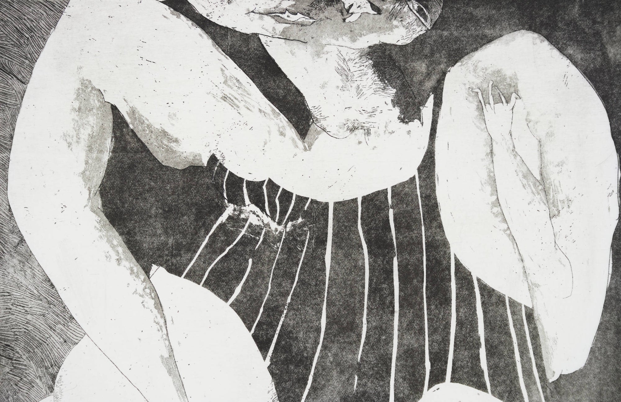 Baldessin’s work explored existentialism, sexuality, boundaries, and fractured identity. Figures recur throughout his practice, twisting into contorted shapes, their faces often concealed or veiled in shadow. A sense of mystery permeates his work, underscoring The Bather I—a stylised portrait of a lone bather, her water-slicked hair obscuring much of her face. The figure folds inward upon herself, a tangle of limbs and sly, watchful eyes.