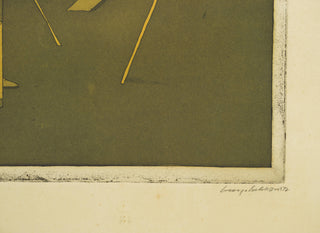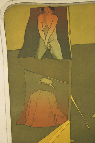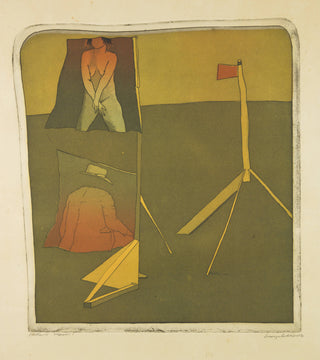 Emblems exemplifies Baldessin’s distinctive blend of surrealism and personal symbolism. Executed in etching with aquatint, the work juxtaposes human forms and abstract structures within a muted, earthy palette. The composition explores themes of identity and spatial ambiguity—hallmarks of Baldessin’s mature printmaking period in the early 1970s. Its layered figures—a partially nude figure and a hat-clad figure—interact subtly with geometric constructions, evoking a contemplative narrative open to interpretation.