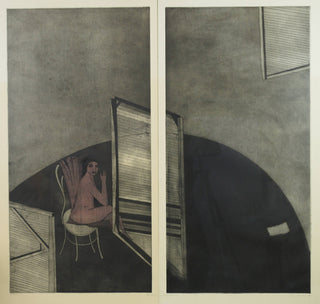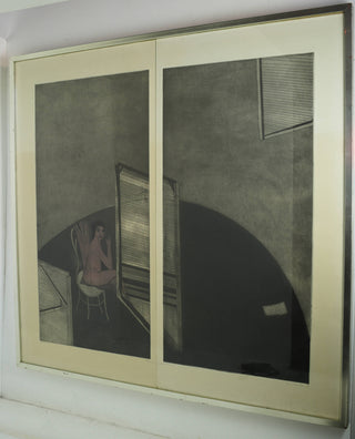 Baldessin’s Personage and Entrances series extends his fascination with the human figure as both subject and actor. The “personage” appears caught in moments of transition—stepping through thresholds, framed by doorways, or poised at the edge of visibility—in this case casting a fleeting glance during a moment of preparation in a mirror. The mirror, an “entrance,” serves as a metaphor for both exposure and concealment, drawing the viewer into the charged drama of encounter while simultaneously dividing and obscuring the composition.