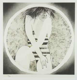 Baldessin's work explored existentialism, sexuality, boundaries, and split personality. Figures recur in Baldessin's work, twisting into contorted shapes, their faces often concealed or veiled in shadow. A sense of mystery percolates his practice, underscoring The Bather I - a stylised portrait of a lone bather, her water-spiked obscuring most of her face. The figure folds inward upon herself, a tangle of limbs and sly, watchful eyes.