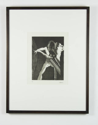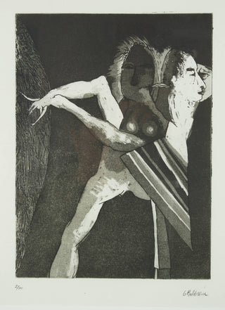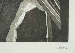 Baldessin’s The Parlour Any Evening presents a striking, almost theatrical interplay of figures, rendered in his signature etching and aquatint technique. The work reflects his fascination with the human body as both symbol and abstraction—figures are layered, contorted, and partially veiled, creating a sense of spatial tension and ambiguity. Stark chiaroscuro contrasts between dark tonal fields and exposed plate lend a sculptural quality to the composition, while the gestural dynamism of limbs and bodies heightens its expressive impact.