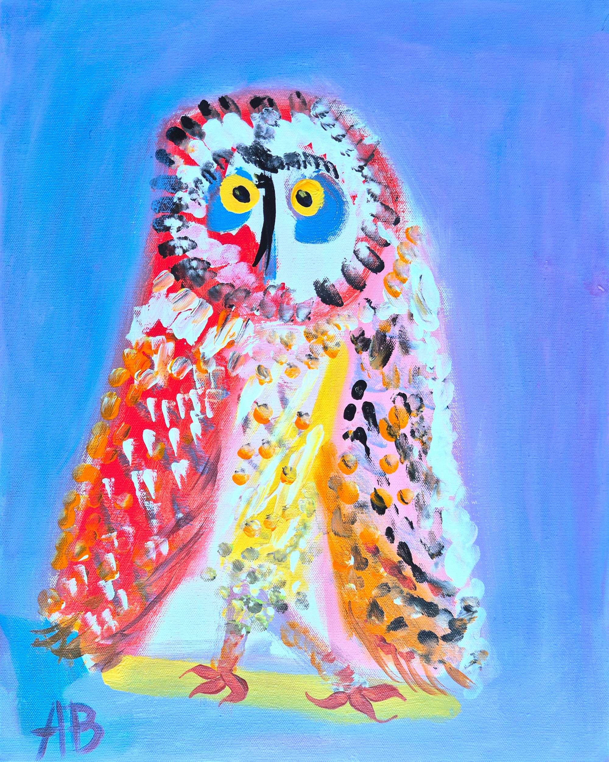 Electric with life and colour, this painting presents the owl as both sentinel and riddle - a timeless emblem of instinct, wisdom, and the worlds we sense but cannot quite see. Colour surges across the surface in confident, expressive gestures, balancing instinctive energy with moments of surprising tenderness. The result is a work that feels at once grounded in nature and untethered by it, pulling the viewer into a lush, imaginative realm. Layers of texture and playful mark-making give the owl a vivid presence, as though it is quietly observing, contemplating, and perhaps keeping a few mysteries of its own.