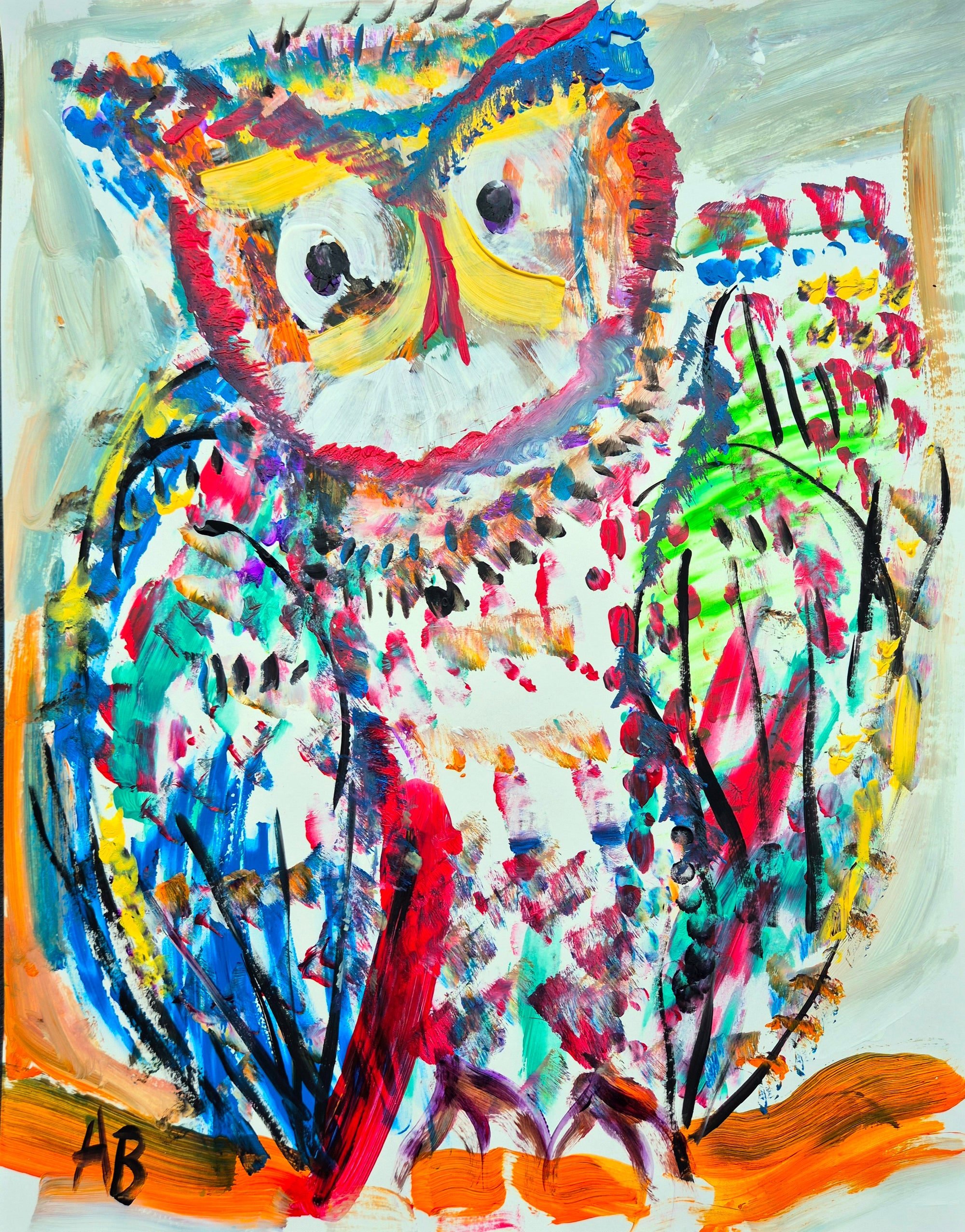 Electric with life and colour, this painting presents the owl as both sentinel and riddle - a timeless emblem of instinct, wisdom, and the worlds we sense but cannot quite see. Colour surges across the surface in confident, expressive gestures, balancing instinctive energy with moments of surprising tenderness. The result is a work that feels at once grounded in nature and untethered by it, pulling the viewer into a lush, imaginative realm. Layers of texture and playful mark-making give the owl a vivid presence, as though it is quietly observing, contemplating, and perhaps keeping a few mysteries of its own.
