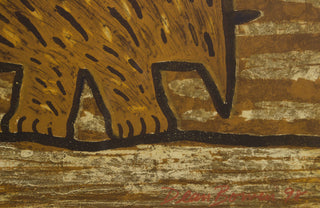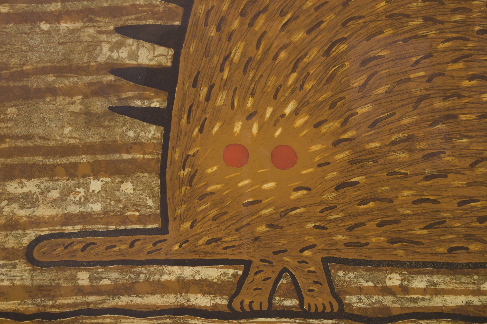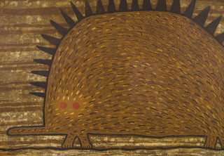 In his 1998 etching ‘Echidna’, Bowen uses the native Australian animal as a totemic representation of how he sees himself within the universe. Using his signature stylistic approach, Bowen infuses the echidna with a distinct sense of personality, creating the impression that he is both animal and man. With glowing red eyes and large accented spines, the echidna appears solitary in the scene, seemingly posing for a portrait. As with many of Bowen’s works, beneath the innocent visual appearance lies a profound investigation into man’s relationship with the ever-changing world.