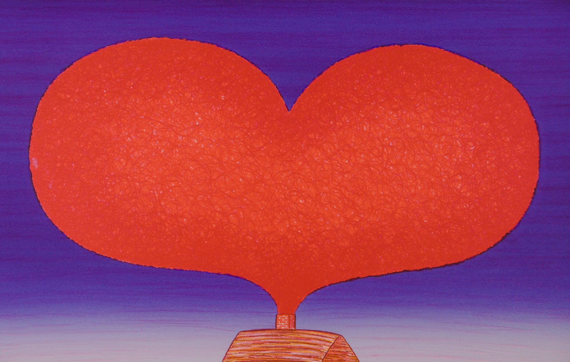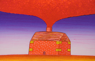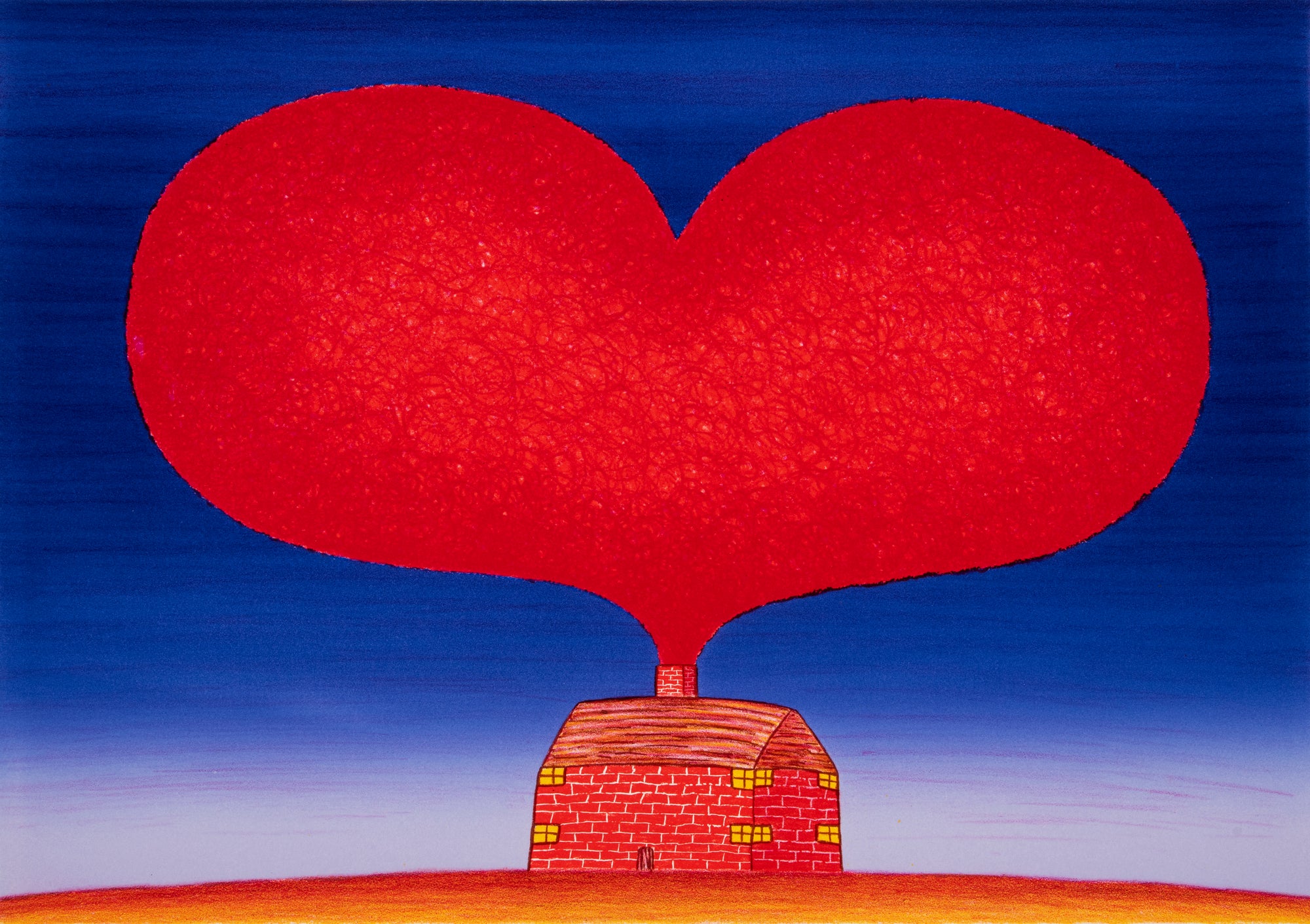 In the 2022 lithograph, ‘The Home of Love’ reflects on the home as a space that offers comfort, joy and sanctuary. Picturing a house with a red heart-shaped cloud billowing out from its chimney, this work flirts with Pop Art qualities through its vibrant colour palette and flattened surfaces. This work represents the domestic realm as a space that captures intimate moments, associated with a deep sense of affection, warmth and sanctuary. As characteristic of Bowen’s practice, he seamlessly blends personal experiences with collectively understood themes, able to resonate with one’s own memories of home.