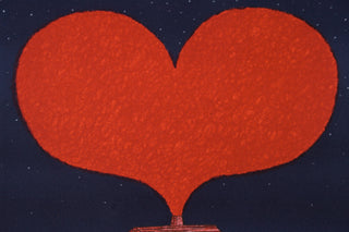 In ‘The House of Love’ (2024), Bowen turns his gaze to the home as a place of comfort and sanctuary. A red, heart-shaped cloud rises from the chimney of a house, transforming a familiar suburban scene into a tender symbol of joy and affection. With its vibrant palette and flattened, graphic form, the work gently flirts with Pop Art while remaining deeply personal in tone.