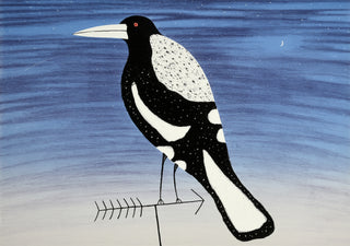Created in 2018, 'Twilight Magpie' explores the delicate balance between suburban and natural environments. Characteristic of Bowen’s playful sensibility, the work offers a refreshing perspective on Australian wildlife. Replacing the traditional rooster with a watchful magpie, Bowen transforms the humble weather vane into a symbol of wit and national character. The bird gazes serenely over the world below, standing sentinel beneath a sleepy twilight sky. This quintessentially Australian scene reflects the closeness between suburban life and native fauna, even within our built landscapes.
