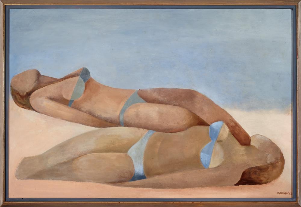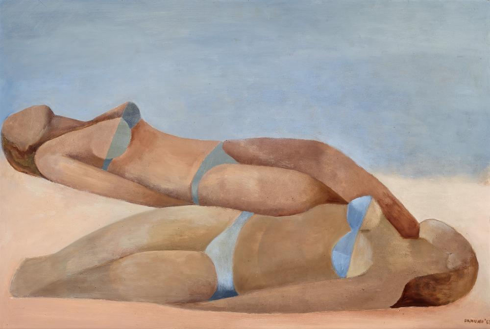 Throughout her oeuvre, Braund repeatedly returned to the beach. Like artists before and after her, she recognised the vital role the beach plays in Australian culture as well as the formal delights of bodies by water. Her beach-goers are pared back to boulders of shoulder, bottom and stomach, captured in a palette that emanates heat as it does here in this original oil painting. As art critic Bernard Shaw observed of her work in 1964, it is “linked with a shrewd and civilised eye for the bizarre and comical”, an awareness that simple does not necessitate seriousness.