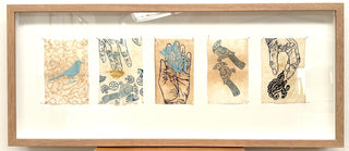 Button’s ‘A Travelling Tale from Rajasthan & Gelderland’ is a series of 5 unique state prints that delineate the artist’s work and travel overseas. Created during a residency in the Netherlands in 2014 and referencing her travels to India, Button merges visual motifs from both Dutch and Indian cultures. In this work, the recurring presence of the hand is representative of the artist herself, a visual symbol that appears within many of her works.