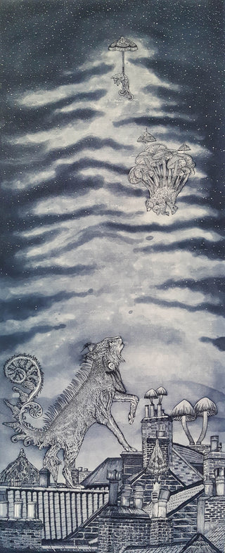 Caprice’s 2022 etching “So long” features a hybrid cat looking up at a sky filled with flying creatures seemingly elevated by mushroom balloons. This expansive print is otherworldly, picturing a starry night sky where this rooftop scene could be nothing more than a dream. The intricate details of this print speak to Caprice’s careful, detail-oriented craftsmanship. While uncanny in appearance, these creatures’ search for connection is undeniably human, saturating this print with a strong feeling of warmth and affection.
