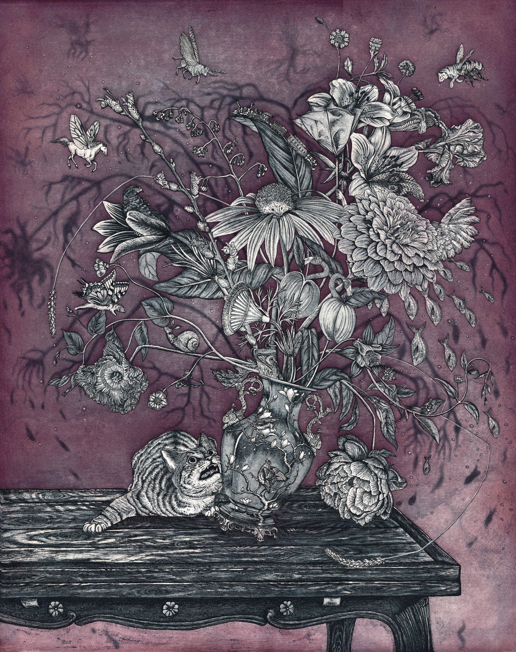 “We all fall down” features a domestic scene of a cat toppling a vase of flowers. Capturing a snapshot of the vase suspended in motion, Caprice humorously makes the scene larger than life. Showing the cat’s shocked expression in the shadow of the oversized vase, Caprice transforms a moment of mischief into a spectacle worthy of attention. This etching highlights her eye for detail, capturing this scene intricately with a practised hand.
