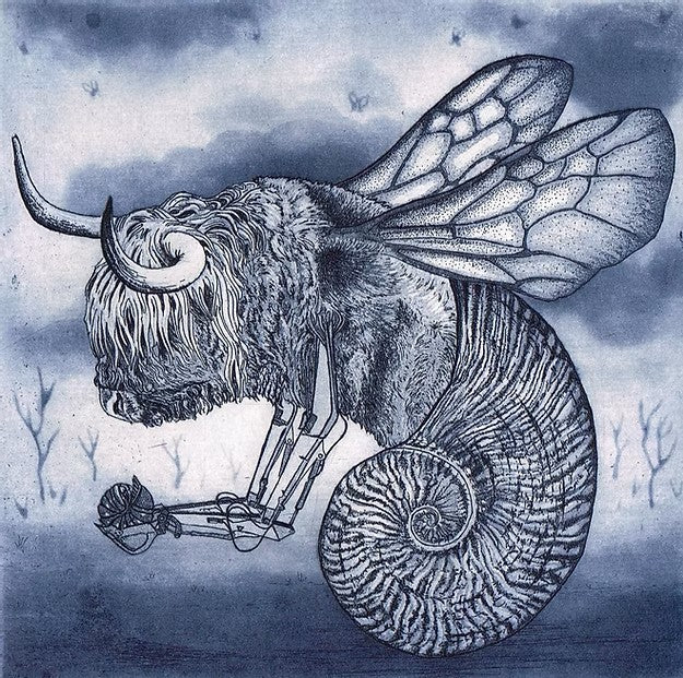 Hannah Caprice is a contemporary printmaker based in Melbourne, Victoria. Caprice’s work features eccentric creatures searching for solace and belonging. These themes reflect on her background being raised in a cross-cultural household, where Caprice sought comfort in being an “adaptable misfit.” Her fantastical creatures are an ode to self-acceptance.