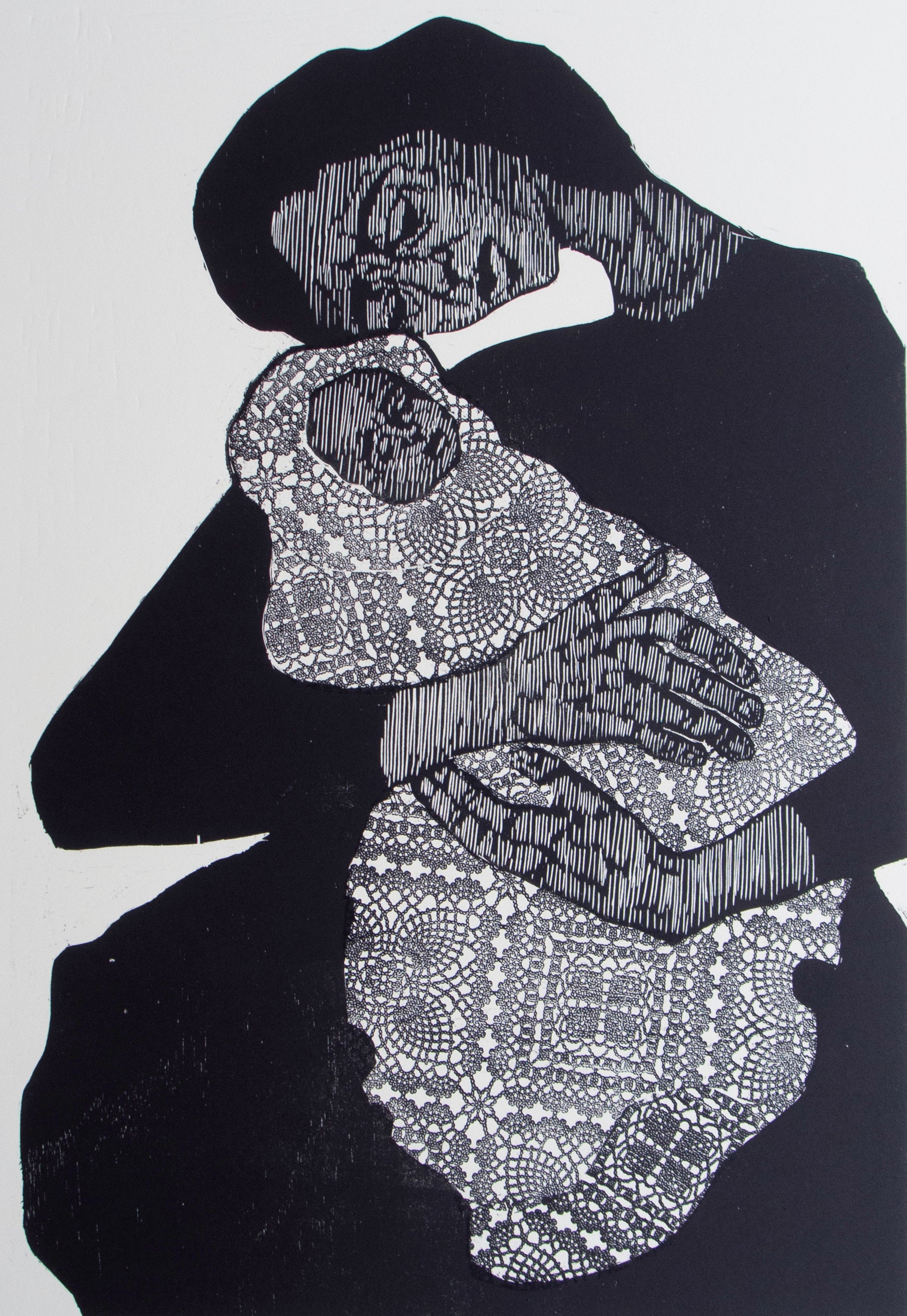The 2025 woodcut, ‘Mother and Child’ pictures a mother cradling her newborn, capturing the immediate connection experienced between a mother and child. Printed in black and white, Castell highlights the expressions of her subjects, offering a snapshot of an embrace filled with emotional intimacy. This scene is intricately detailed, highlighting Castell’s skillful command over the printmaking medium and eye for balanced compositions.