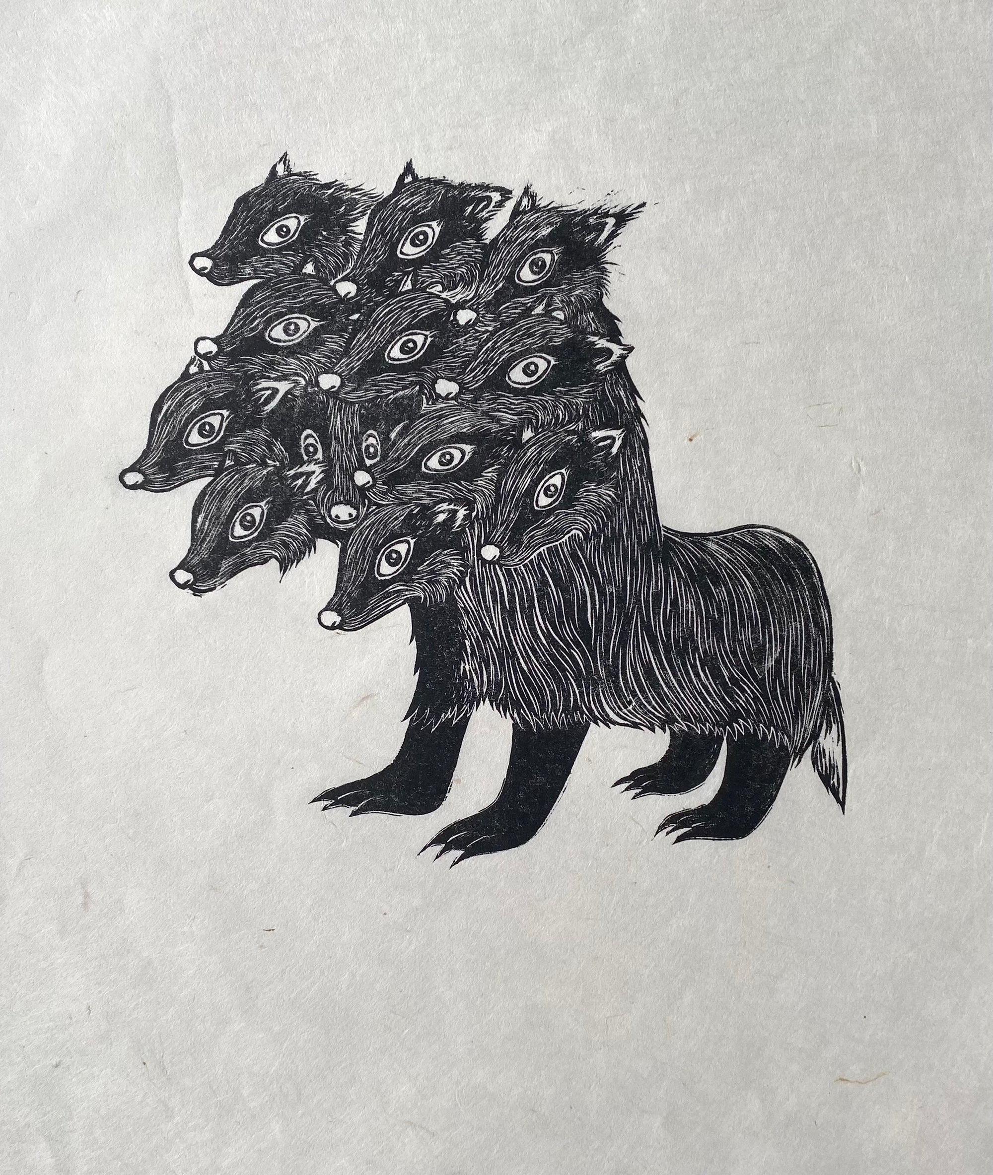 In his 2025 linocut Protector, Compton presents a loyal yet beastly twelve-headed companion, printed with exceptional delicacy on Japanese paper. With its many doleful eyes watching on vigilantly, this creature is playfully reminiscent of an ancient mythological archetype - perhaps a 'friendlier' version of the guardian Cerberus.