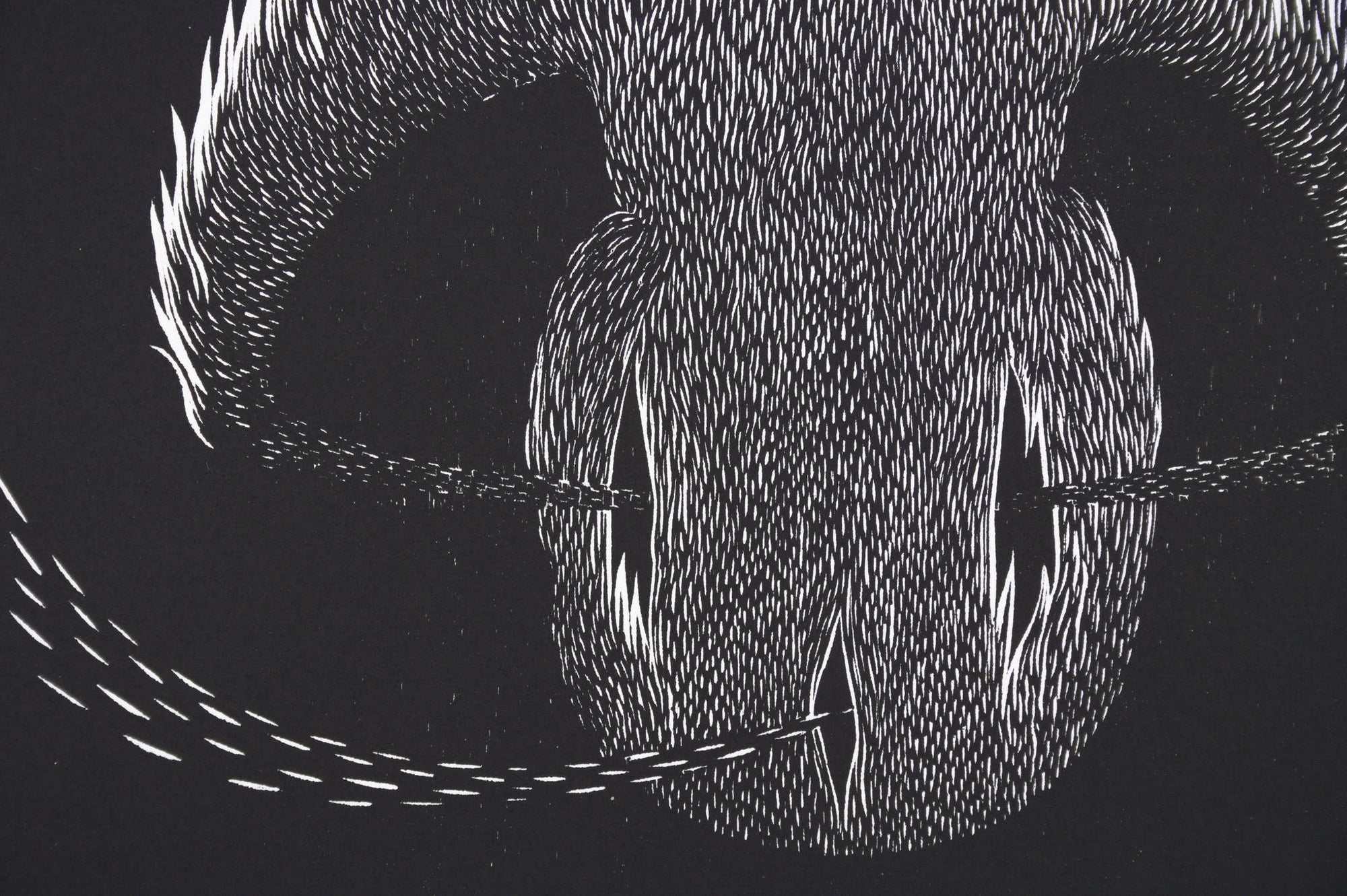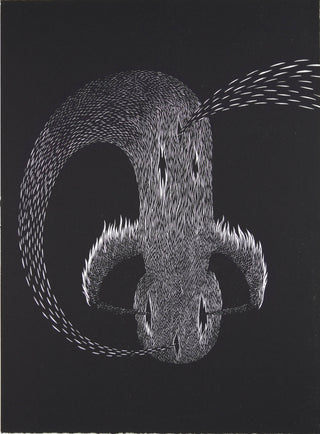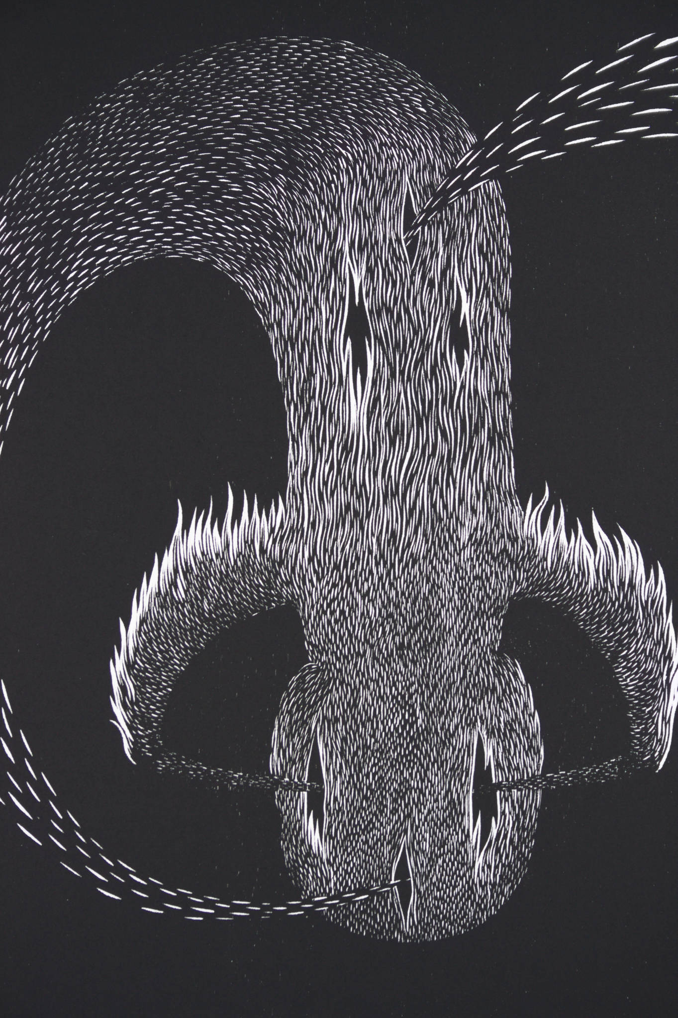 In his 2016 linocut ‘Regret Eater’, Compton explores the idea of interconnection. Against a black background, the imagined creature twists and turns across the page, feeding into itself. Using this abstracted form, Compton invites the viewer’s own perspective on where the creature’s body begins, and where it ends.