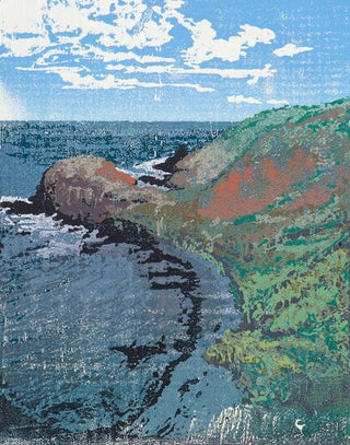 Cooke’s 'Land and Sea #28' presents a sweeping and vibrant portrayal of the Victorian coastline. Using his classic reduction woodcut style, Cooke creates a scene that is instant alive with atmosphere and movement. Cooke’s fascination with the ocean stems from the theory that this is our universal starting place - “the ocean as our origin”. As with many of his works, 'Land and Sea #28' intimately reflects the artist’s relationship with the area in which he lives.