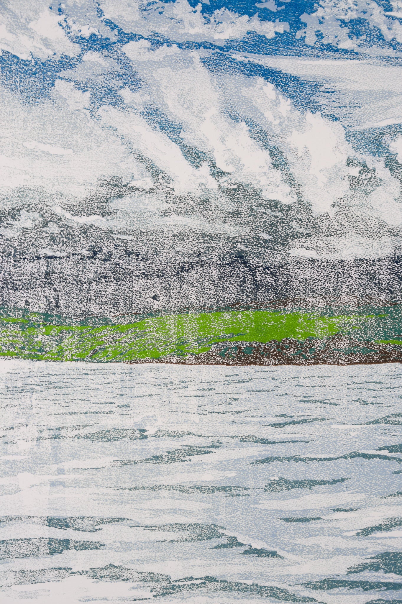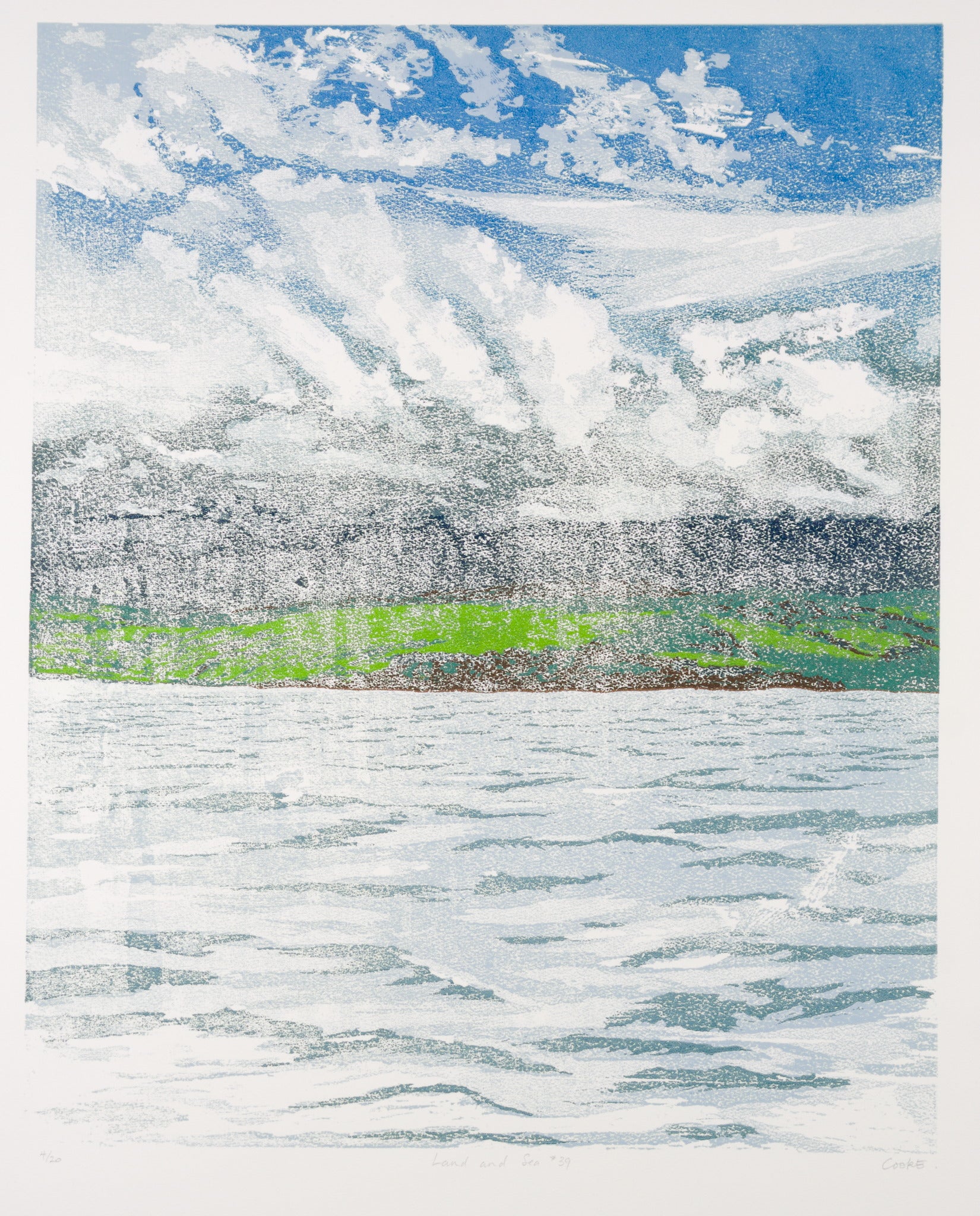 Cooke’s 2019 reduction woodcut “Land and sea #39,” features a serene seascape taken from the Mornington Peninsula. This print is characteristic of Cooke’s vibrant style, picturing a landmass between sea and sky. This contemplative scene resembles a snapshot of a sunset, where the sky is caught between changes in colour. This compelling scene is bright and full of energy, capturing Cooke’s love of the Mornington coastline.
