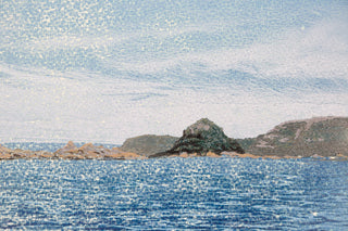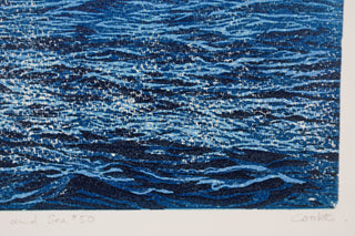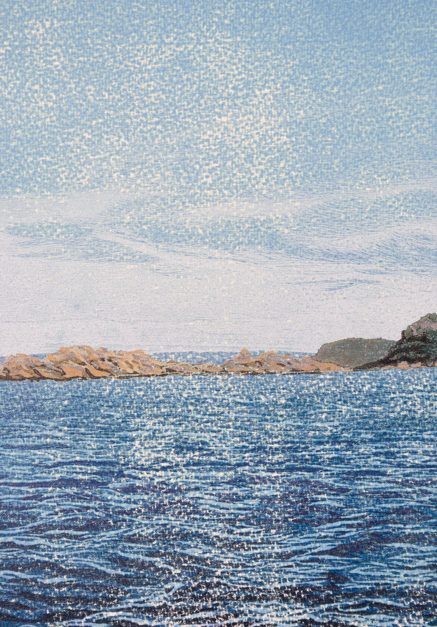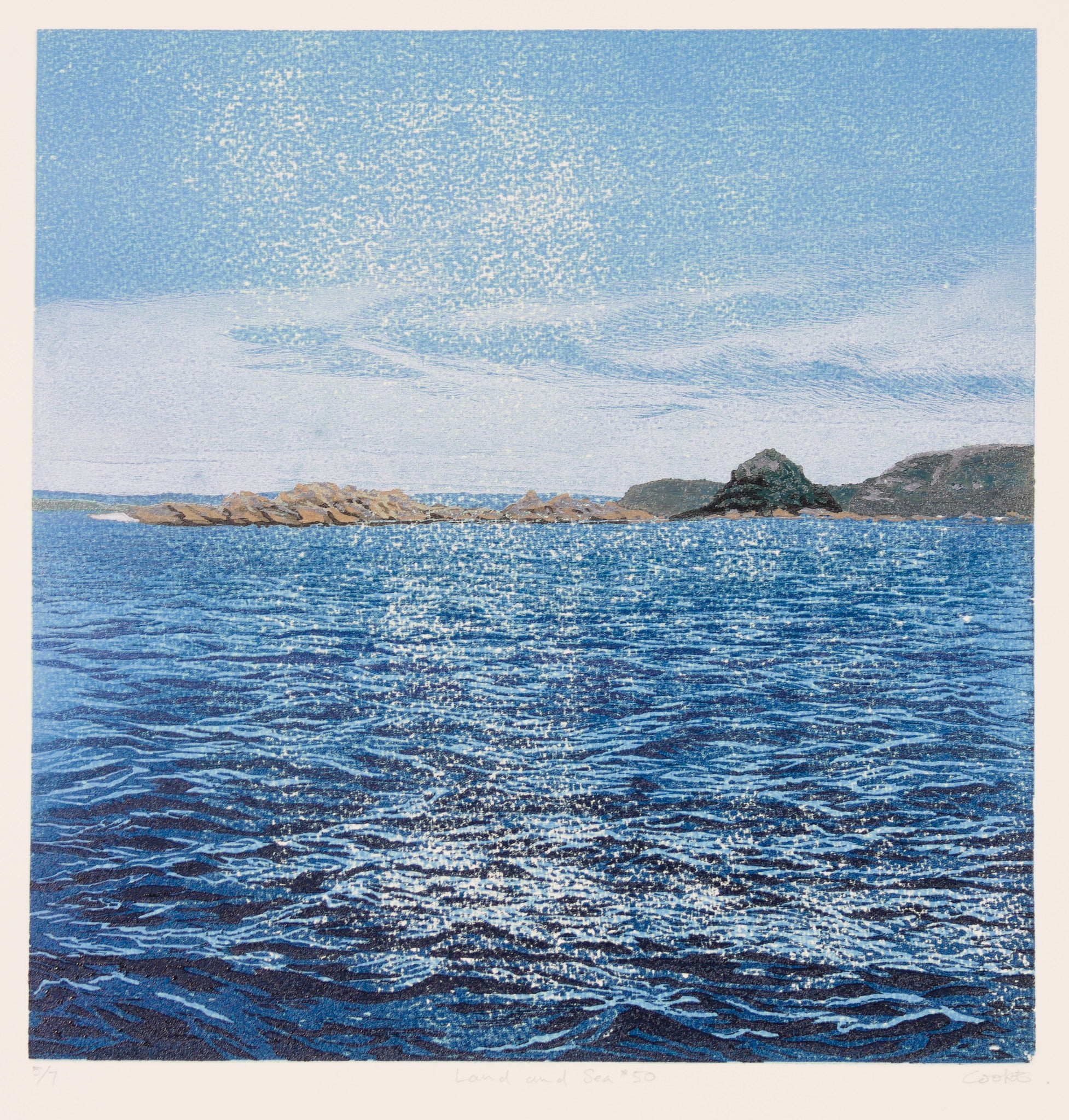 Cooke’s reduction woodcut “Land and sea #50,” pictures the glittering surface of the ocean under the hot Australian sun. This scene places the viewer in the position of a sailor, with the closest land mass far in the distance. This work was created with a combination of hand and press printing, making the final work appear almost painterly through its intricate layers of colour.
