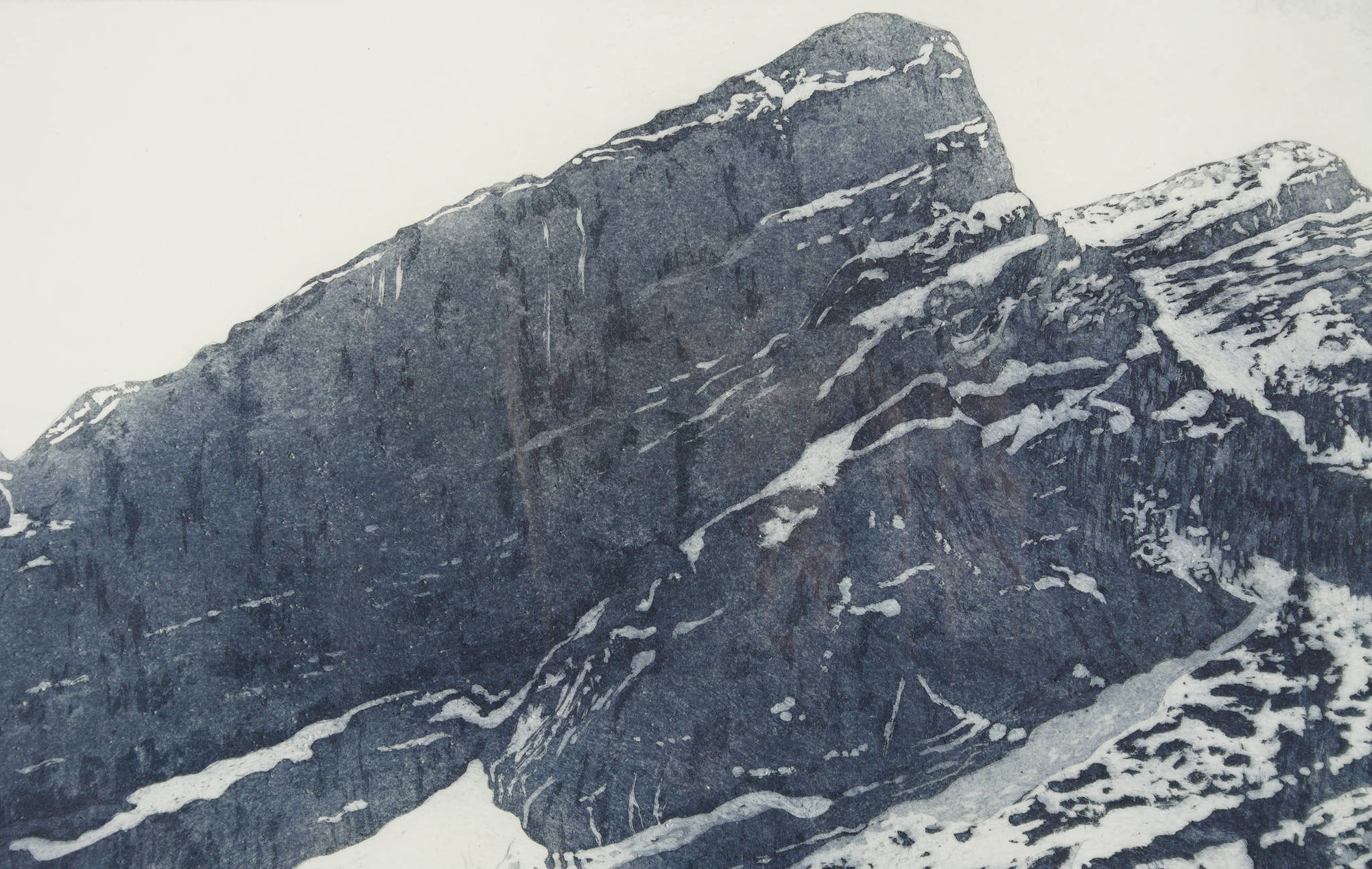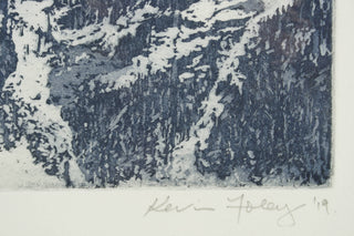 In ‘Snow drift’, the artist captures the monolithic form of a mountain covered in snow. Monochromatic in tones of grey and white, the mountain in this etching takes up the majority of the image, with its peak shown strongly against the stark white sky. A change from his usual representations of rural Australian life, in ‘Snow drift’ Foley captures the drama and moody atmosphere of this winter landscape.