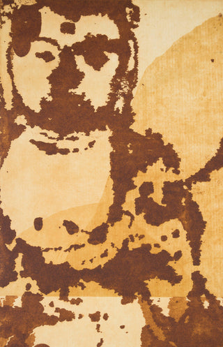 Imbutsu – Travel Story II is a visual sanctuary of memory and mindfulness, inviting the viewer to pause and find stillness. Continuing a saga of exploration and reflection, the work echoes the unexpected warmth of the unknown and ancient spiritual iconography. A Buddha-like figure emerges from a mountainous terrain of earthy ochres and delicate plate markings. The swirling rings are symbolic of an endless cycle, perhaps suggesting that the most profound travel happens within.