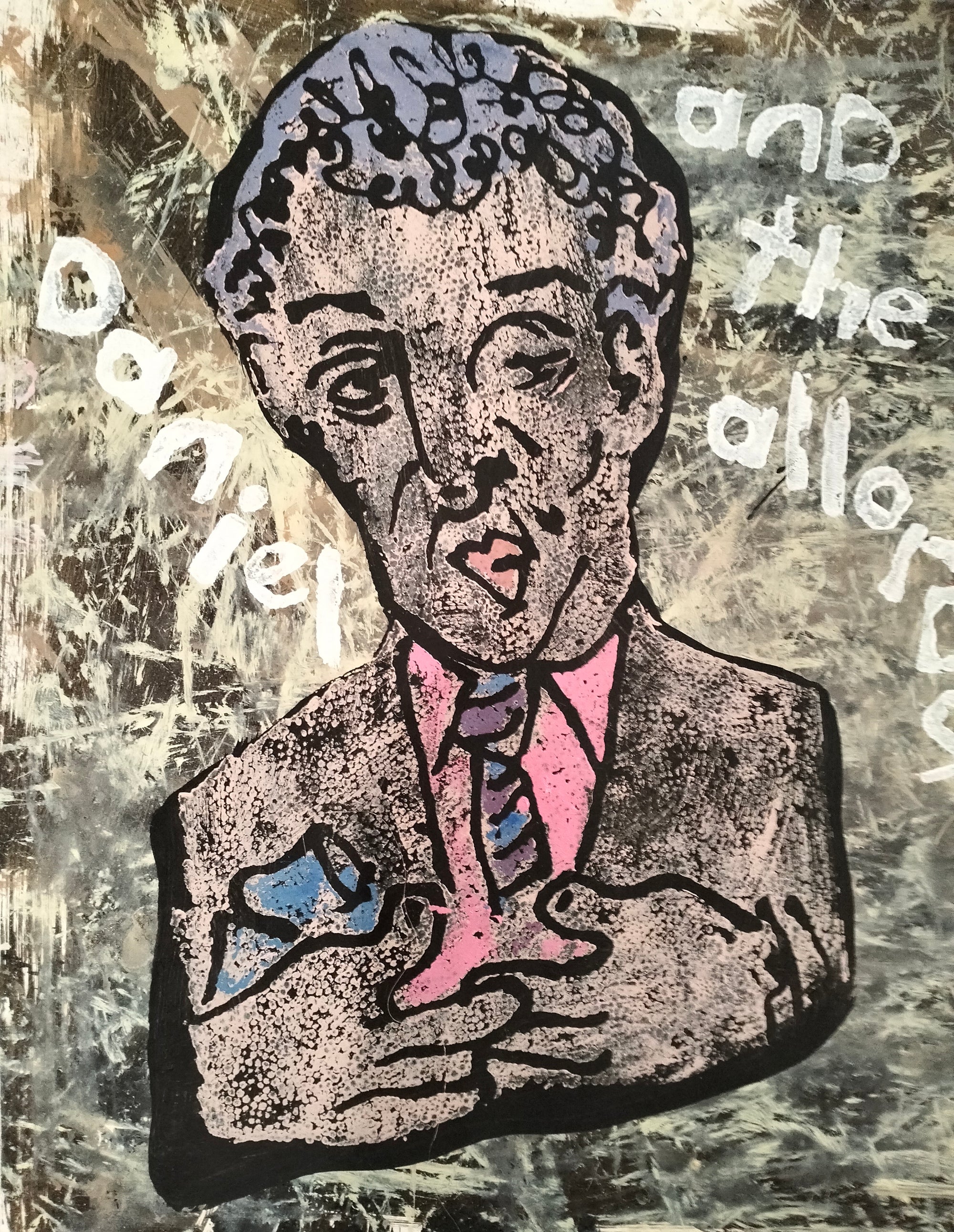 Gorring’s 2025 relief print, “Daniel and the all ords,” features an image of the ABC’s Daniel Ziffer, a familiar face to any who watch his finance reports. Pictured with a sly wink and smirk, Gorring infuses her characteristic sense of humour into her focus on this television reporter. Juxtaposed against a background dense with abstract patterns, this piece is energetic and fuelled by riotous patterns.