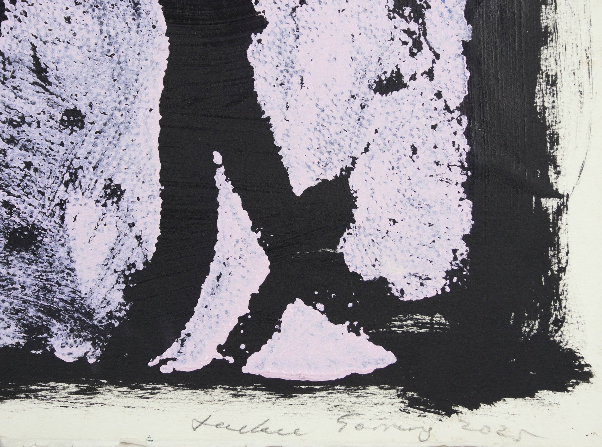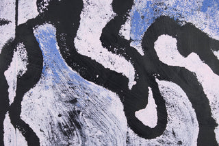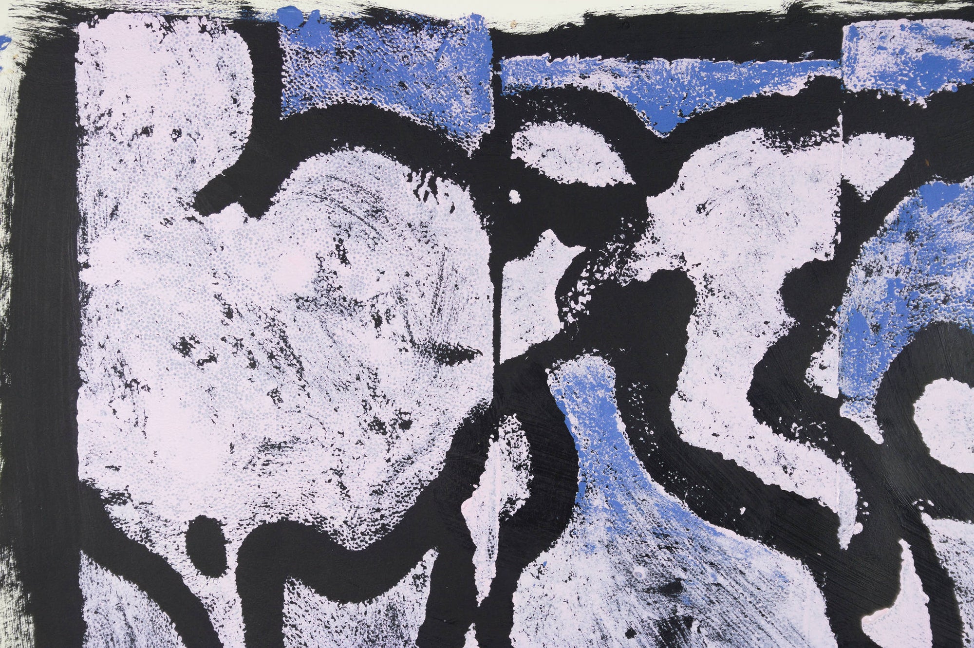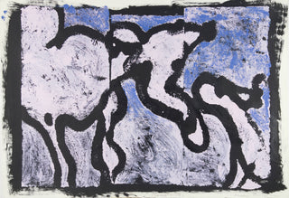 Gorring’s 2025 relief print, “Rosie and Bo,” features two dogs in Gorring’s signature style. This work is dynamic, energised by layers of overlapping dots of colour. Gorring’s choice of vibrant pink and blue contrasts against the stark black of the two dogs, creating a magnetic sense of balance across this piece. While focusing on everyday subject matter, the work’s colour palette saturates this print with a sense of vigour and excitement.