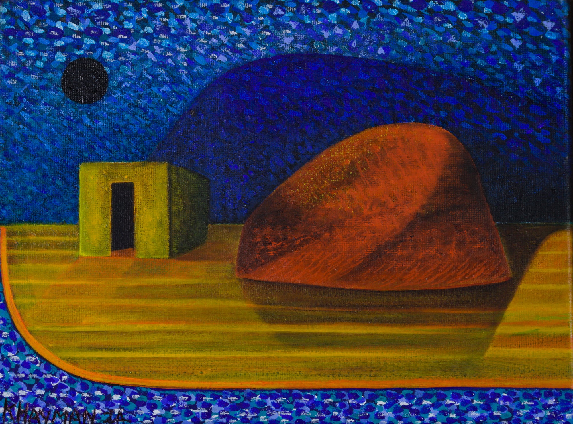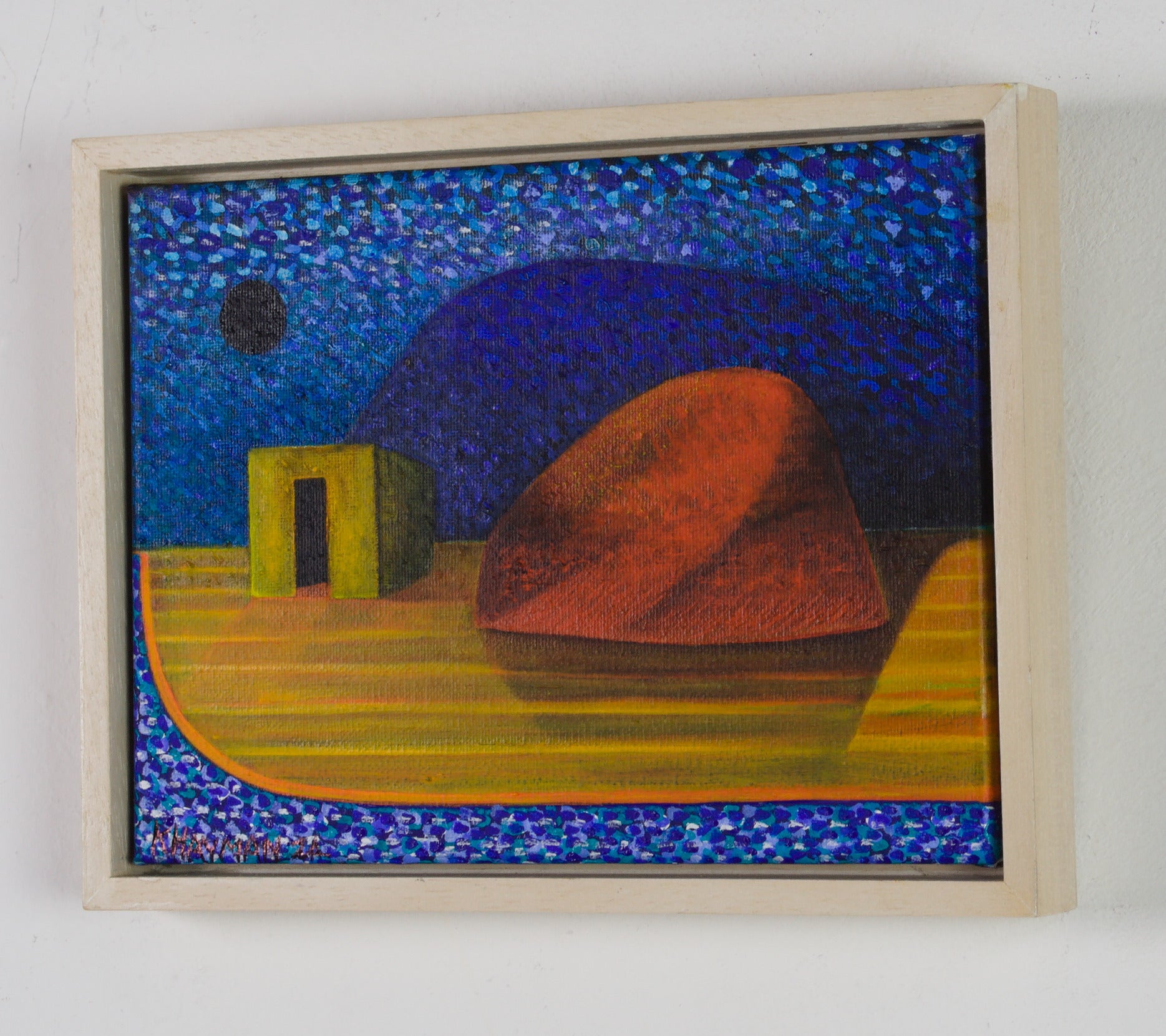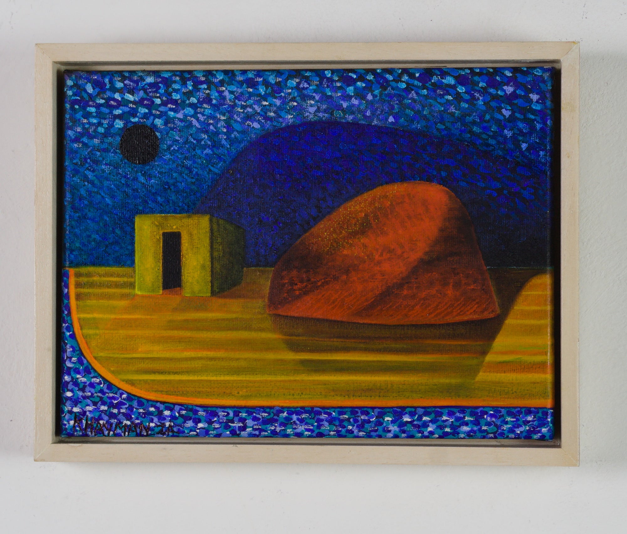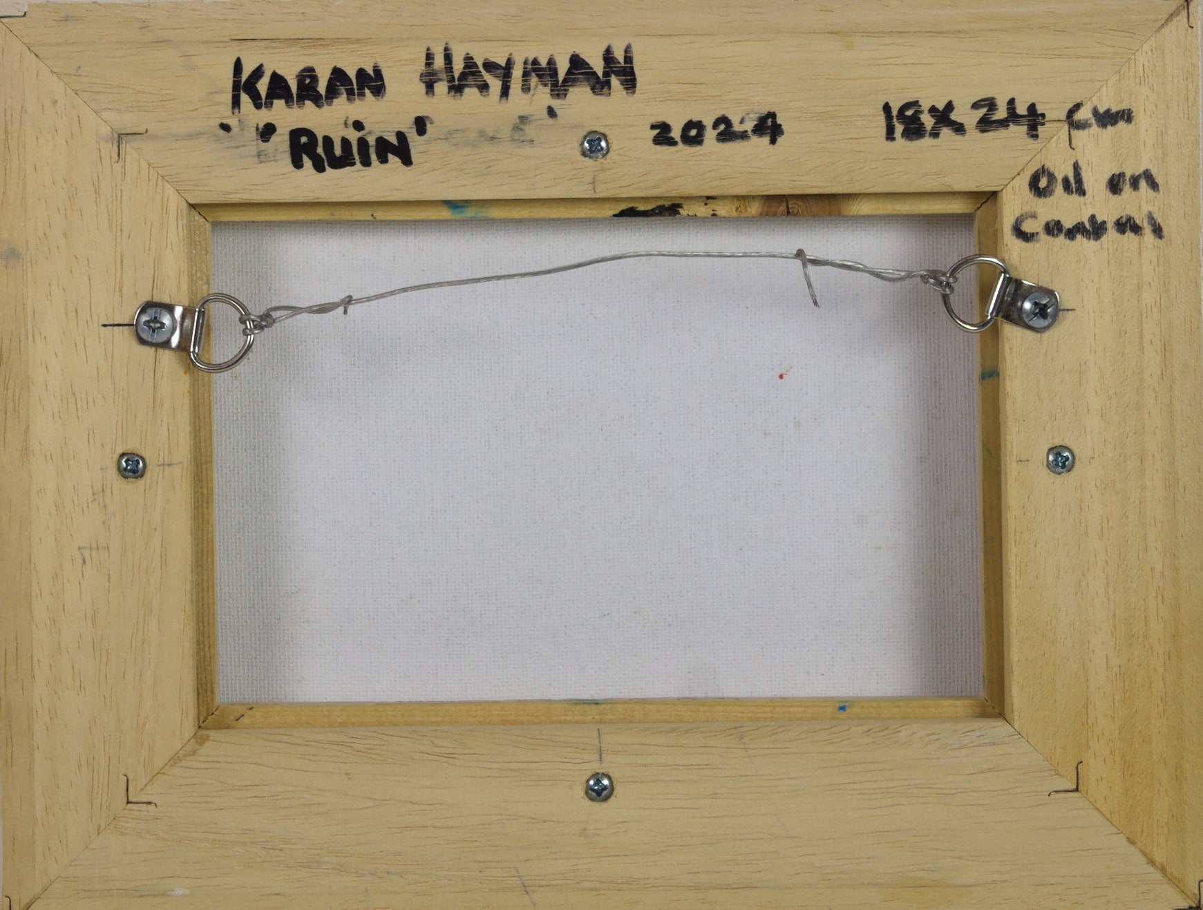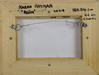 In 'Ruin', Hayman conjures a playful, dreamlike landscape where logic gently slips out of reach. Saturated colour and simplified forms create a scene that feels both familiar and strangely untethered, as if time has paused and space has been quietly rearranged. A solid yellow platform meets a sky alive with flickering, dotted brushwork, setting up a lively tension between structure and softness. The result is a curious, imaginative work that invites you to linger - and to enjoy not quite knowing where you are.