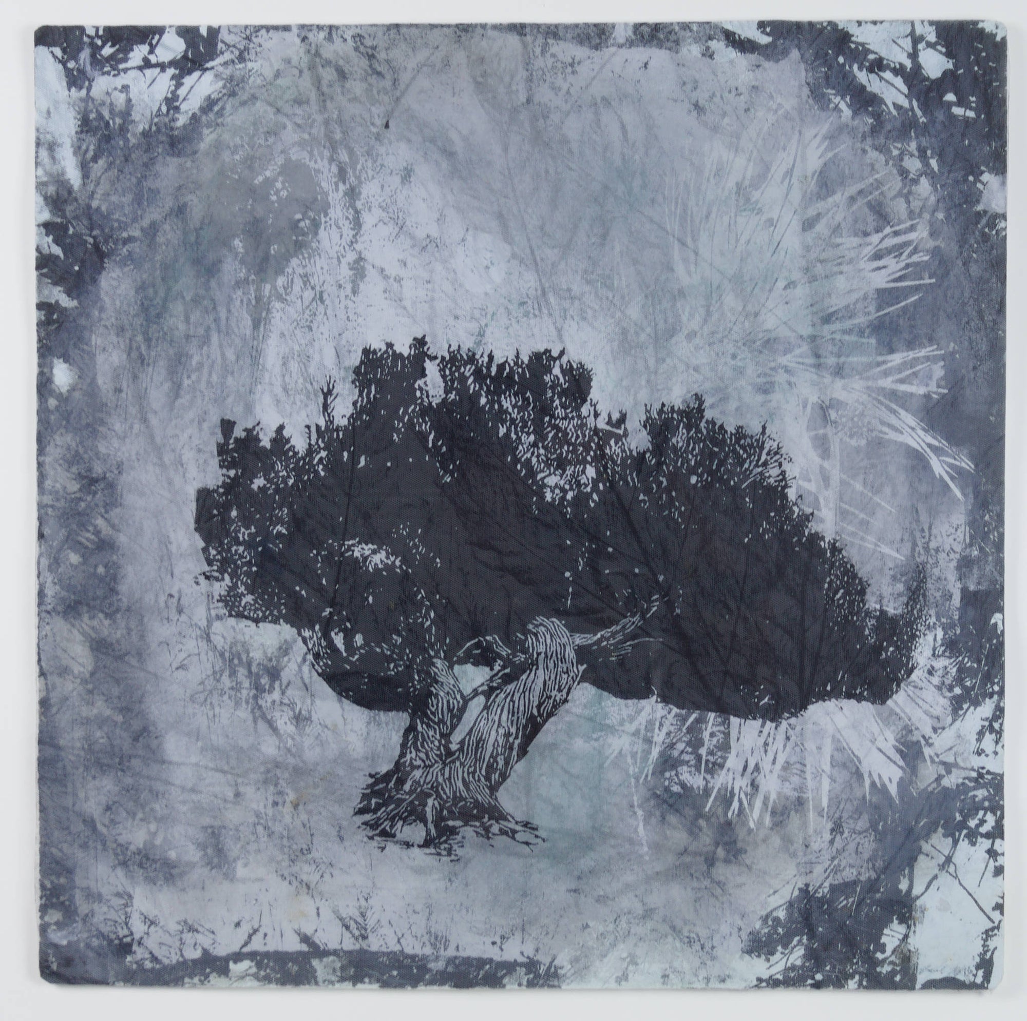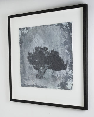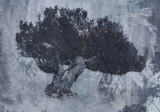 Jodi Heffernan’s 'Coastal Walk' reimagines the possibilities of printmaking through a poetic use of materiality. Built upon a silkscreen base and veiled with sheer tulle, the work captures the wind-battered form of a coastal tree - fragile yet enduring. Across a moody field of greys and blacks, soft tonal shifts and diffused edges convey the movement of a cloudy sky. The tulle overlay amplifies this atmosphere, lending the work a sense of mist, salt air, and the quiet, rhythmic motion of the shoreline.