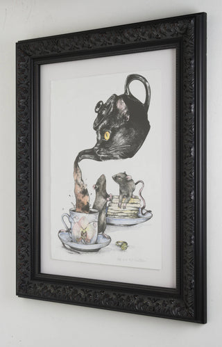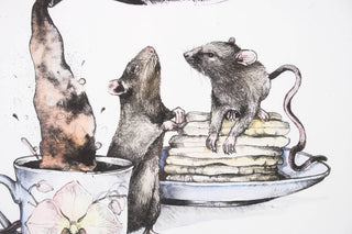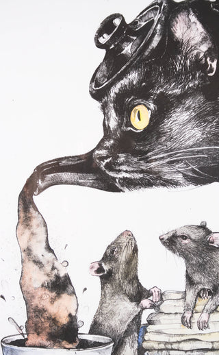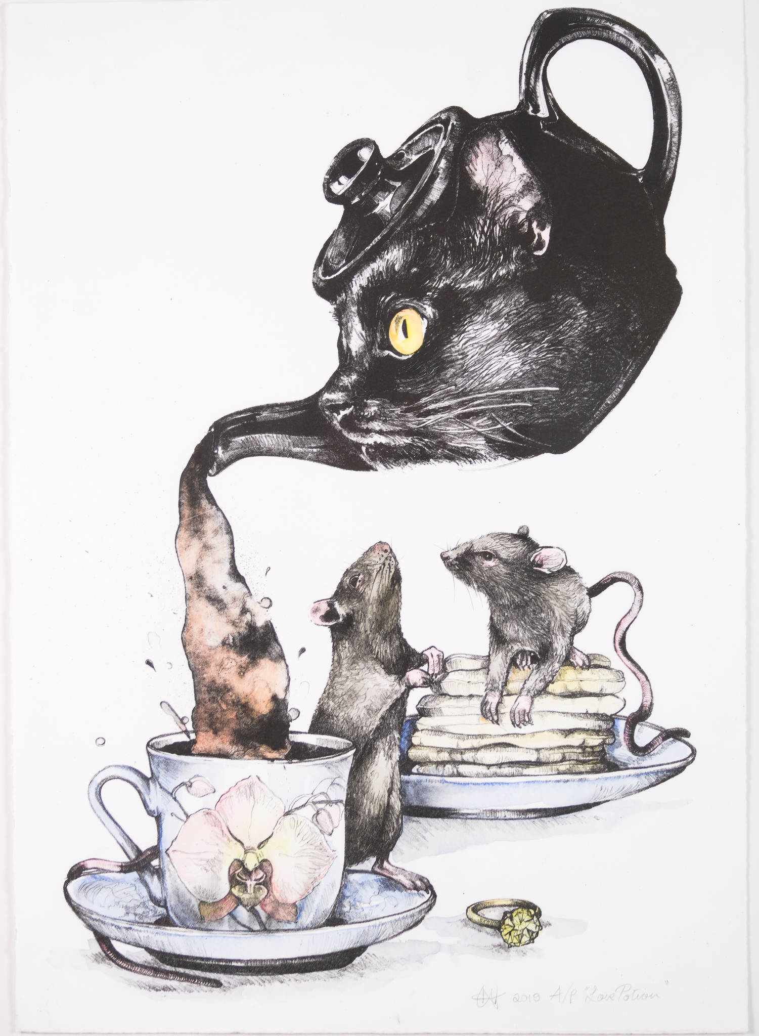 The 2019 hand-coloured lithograph, ‘Love Potion’ pictures a teapot with a cat’s face pouring tea for two mice standing expectantly beneath it. At this fantastical tea party, Hooper solely hosts animals, showing the mice at ease amongst tea cups and platters. Hooper encourages her audience to interpret this story freely, adding a signature touch of playfulness to her take on a fairy tale scene. This print is rife with detail, carefully produced through a combination of hand-colouring and lithograph printing.