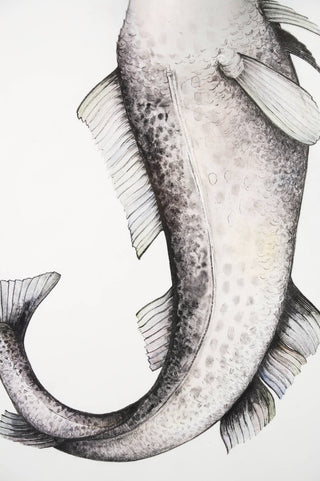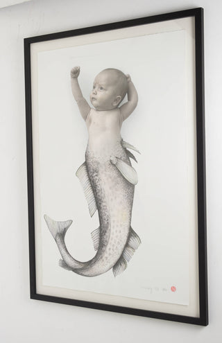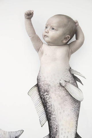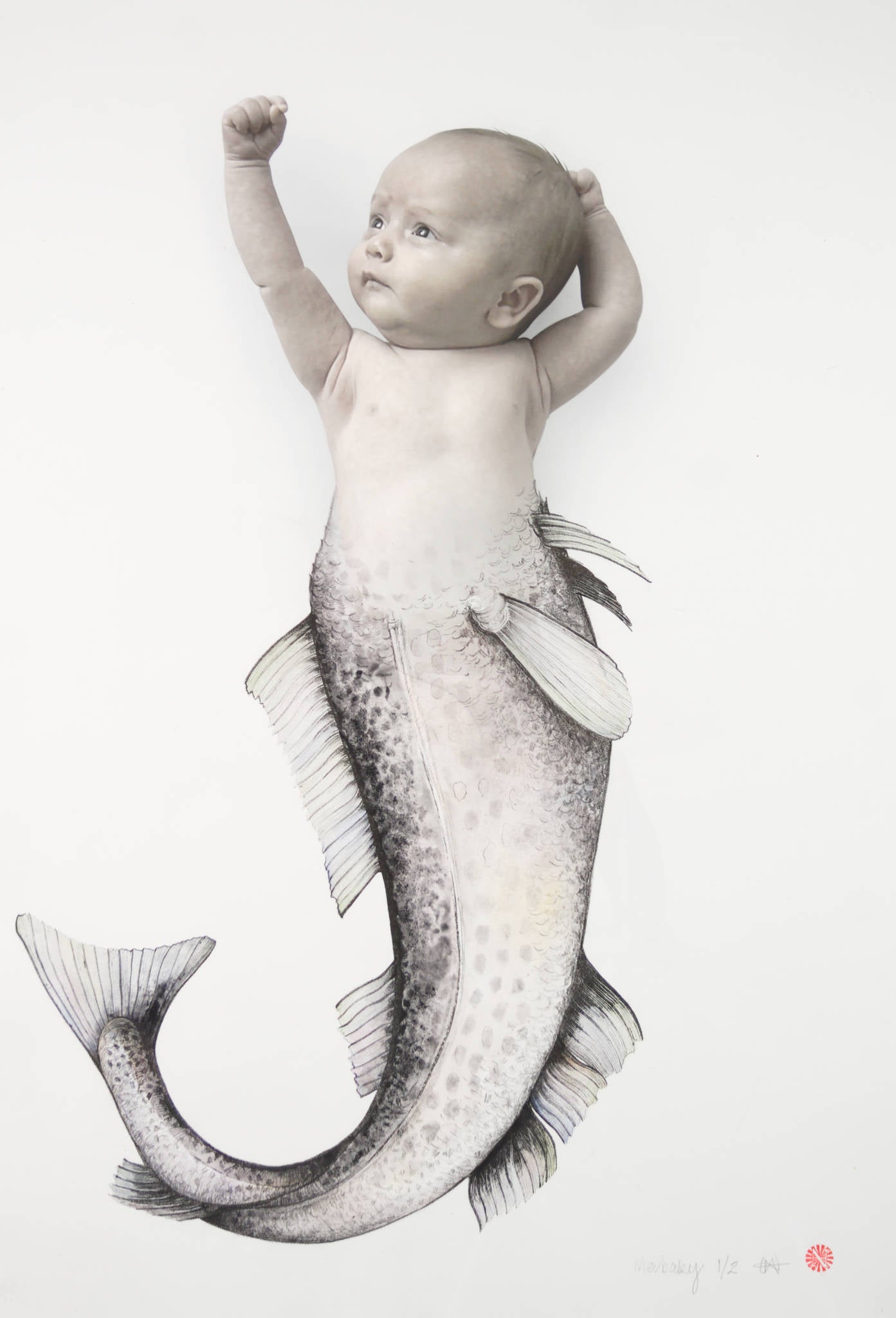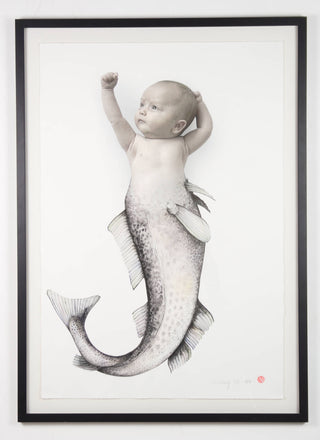 The 2023 lithograph, ‘Merbaby’ pictures a baby with the tail of a fish, capturing Hooper’s interest in the fantastical. This print is characteristic of Hooper’s style, combining elements of realism to produce a surreal image. While borrowing from fairy tale iconography, Hooper renders her work in exquisite detail, adding a tone of endearment to the mystical baby in this print. ‘Merbaby’ contemplates our humanity, encouraging a sense of connection with the subject despite its differences.