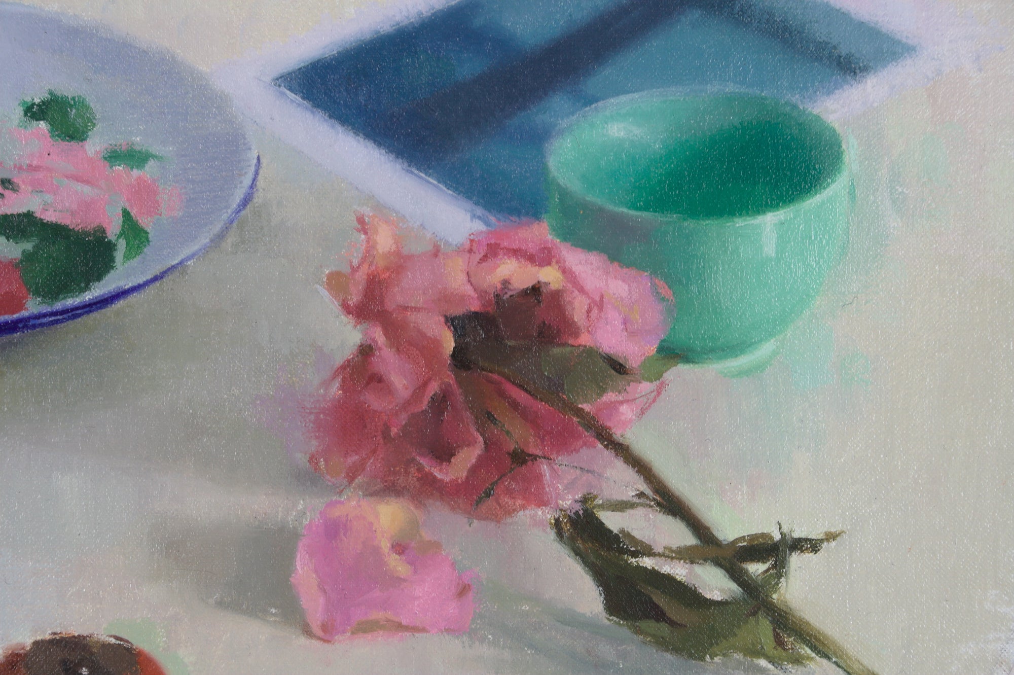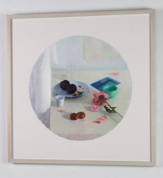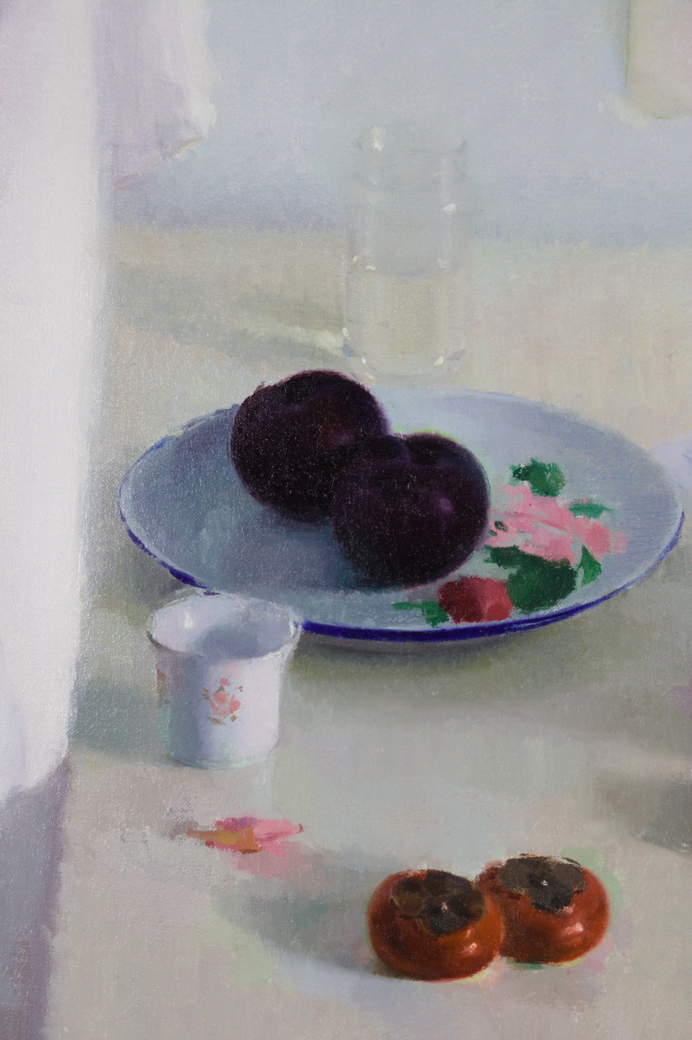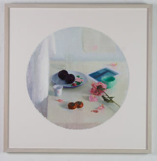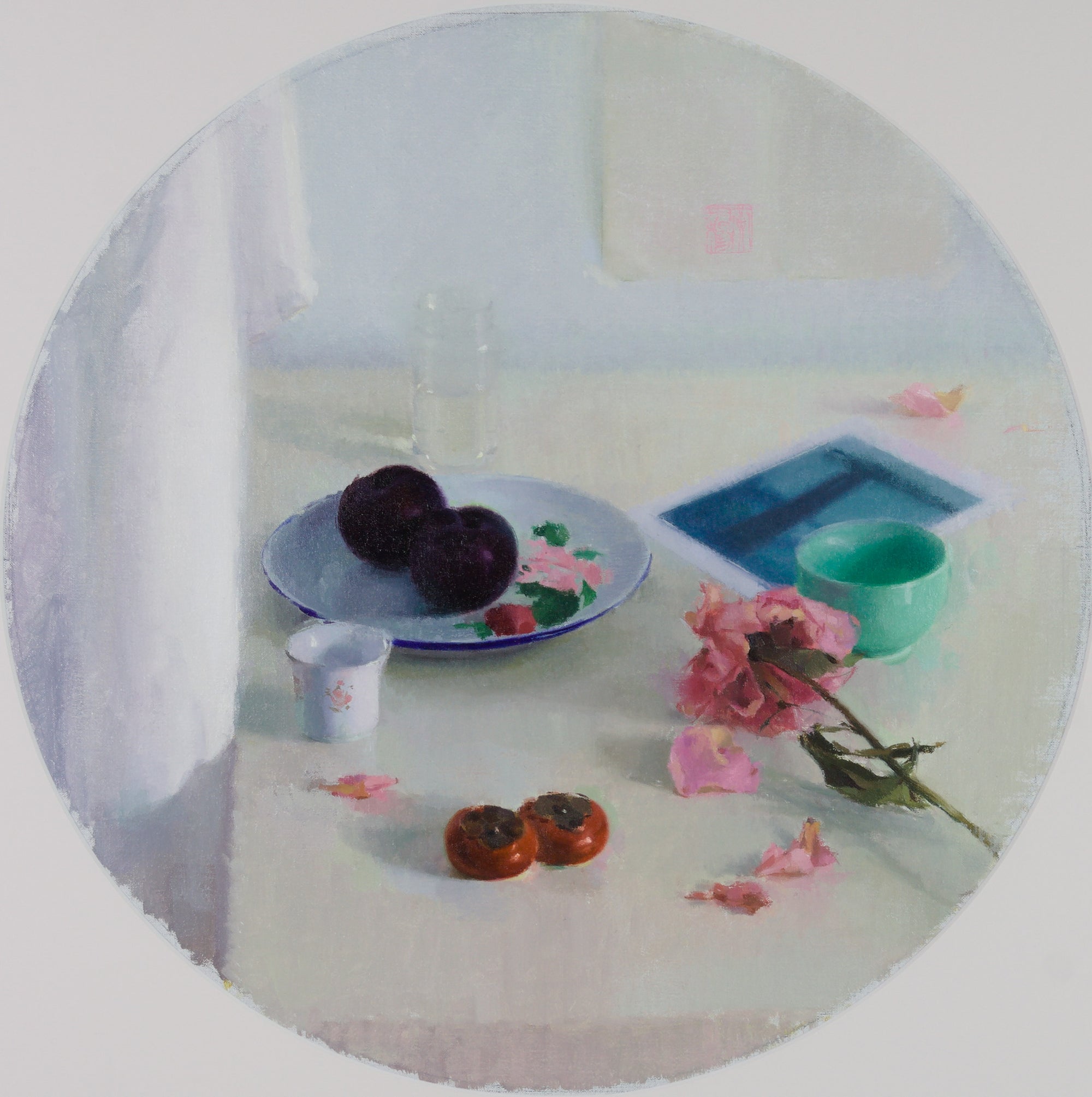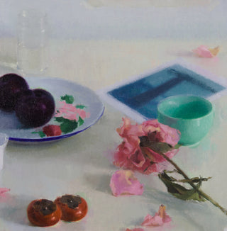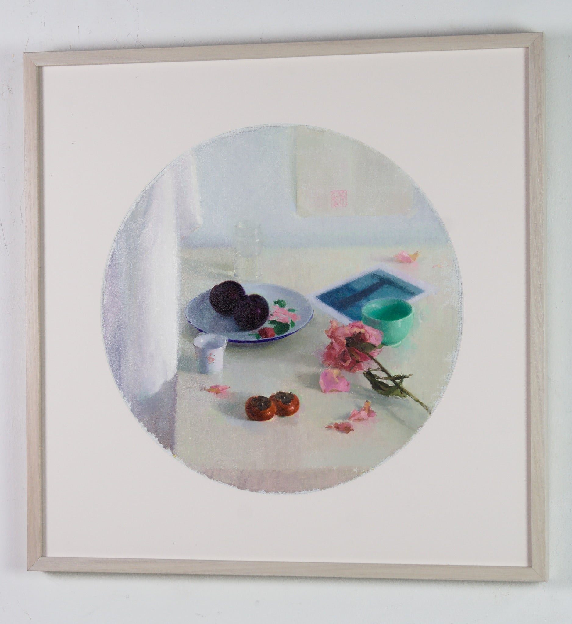 In ‘Offering of Plums and Persimmons,’ Huang paints a still life scene on a unique circular canvas. Alongside the subdued colour palette, the softness of the work is exemplified through the choice of objects - flowers, fruits and fine crockery. The shape of the canvas creates a sense of intimacy, as the viewer almost feels as though they are looking through a peephole or window into the scene. ‘Offering of Plums and Persimmons’ is an intimate piece representative of Huang’s strong command of composition and ability to create atmosphere.