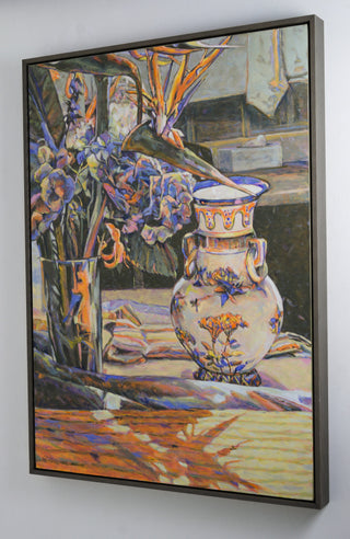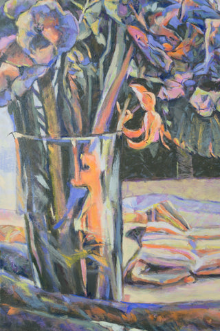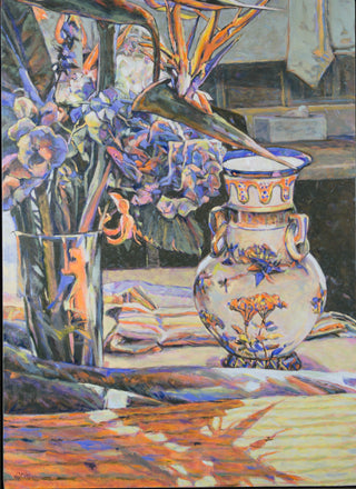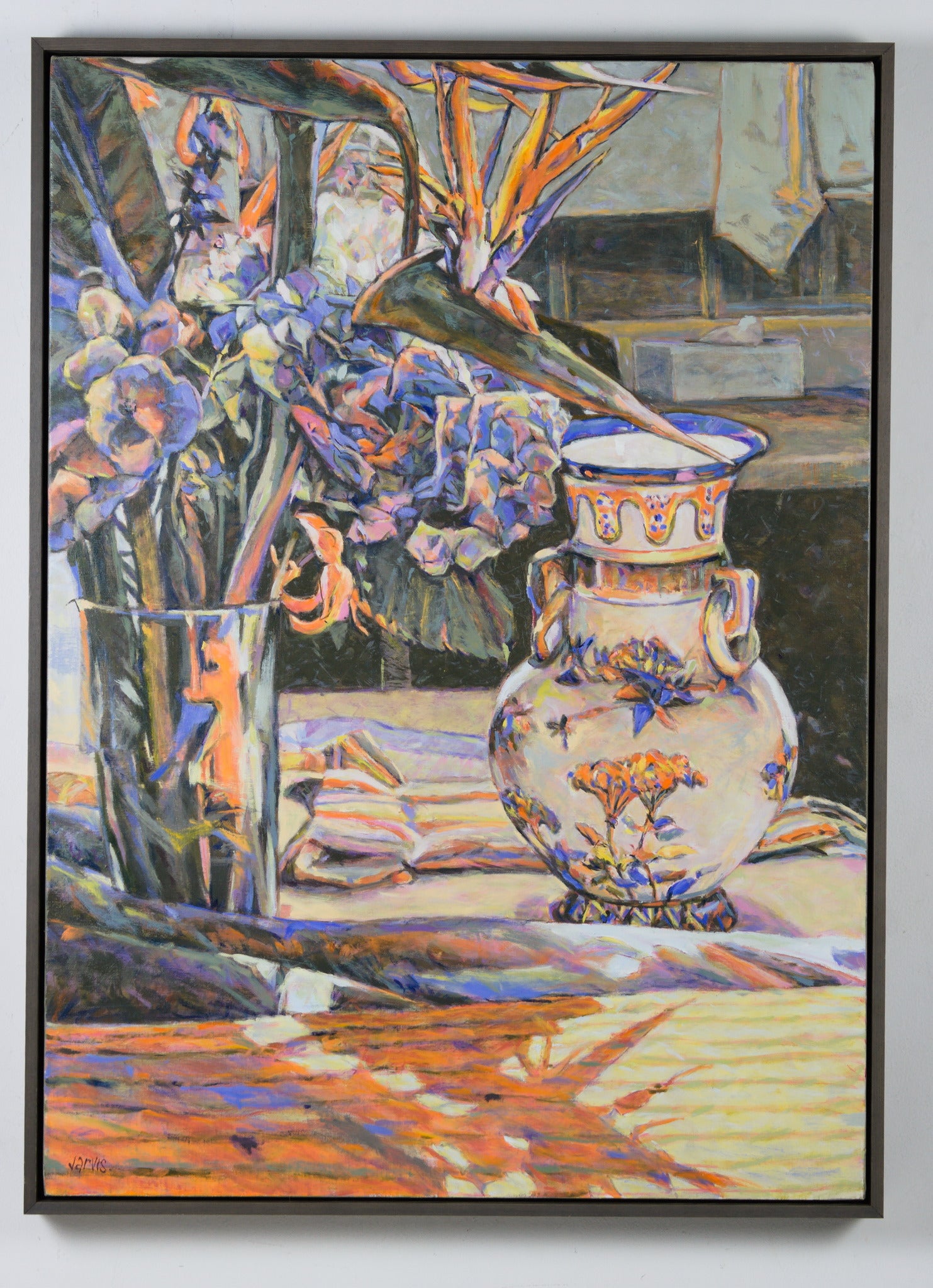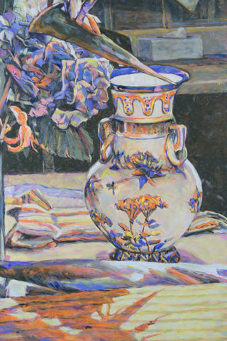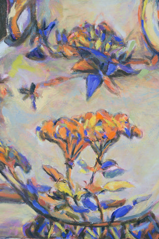 In ‘Still Life in Shadow and Light’, Jarvis creates a richly layered still life scene, arranged in an interior setting. Departing from traditionally composed scenes, Jarvis’ painting is deeply reflective of her own perspective - the flowers are partially obscured from view, the bench is decorated with miscellaneous objects. Through a vivid colour palette and expressionist brushstrokes, Jarvis’ domestic scene feels animated - abundant with life, atmosphere, and movement.
