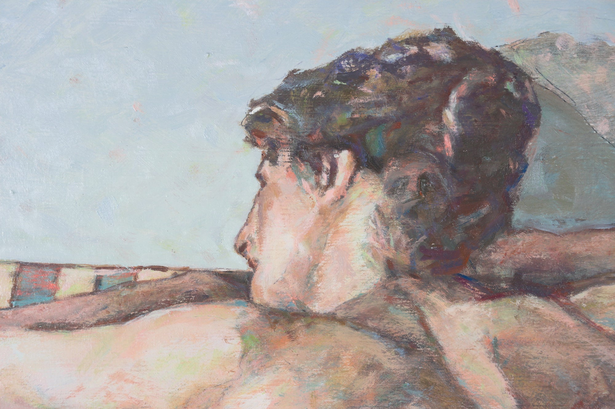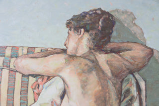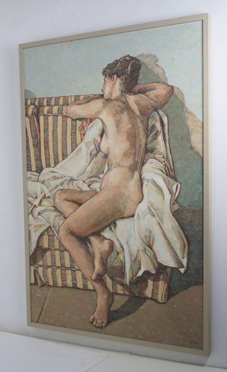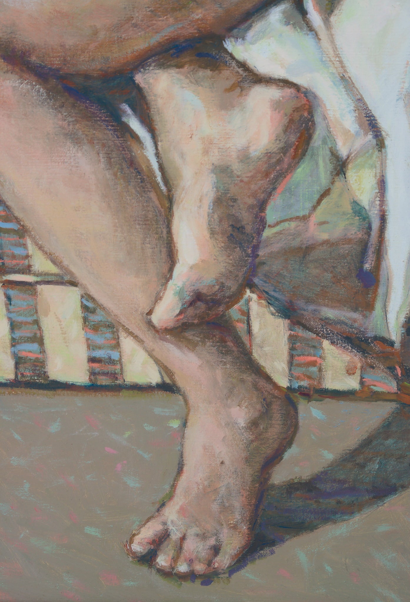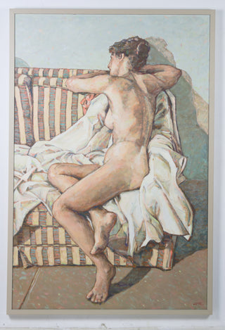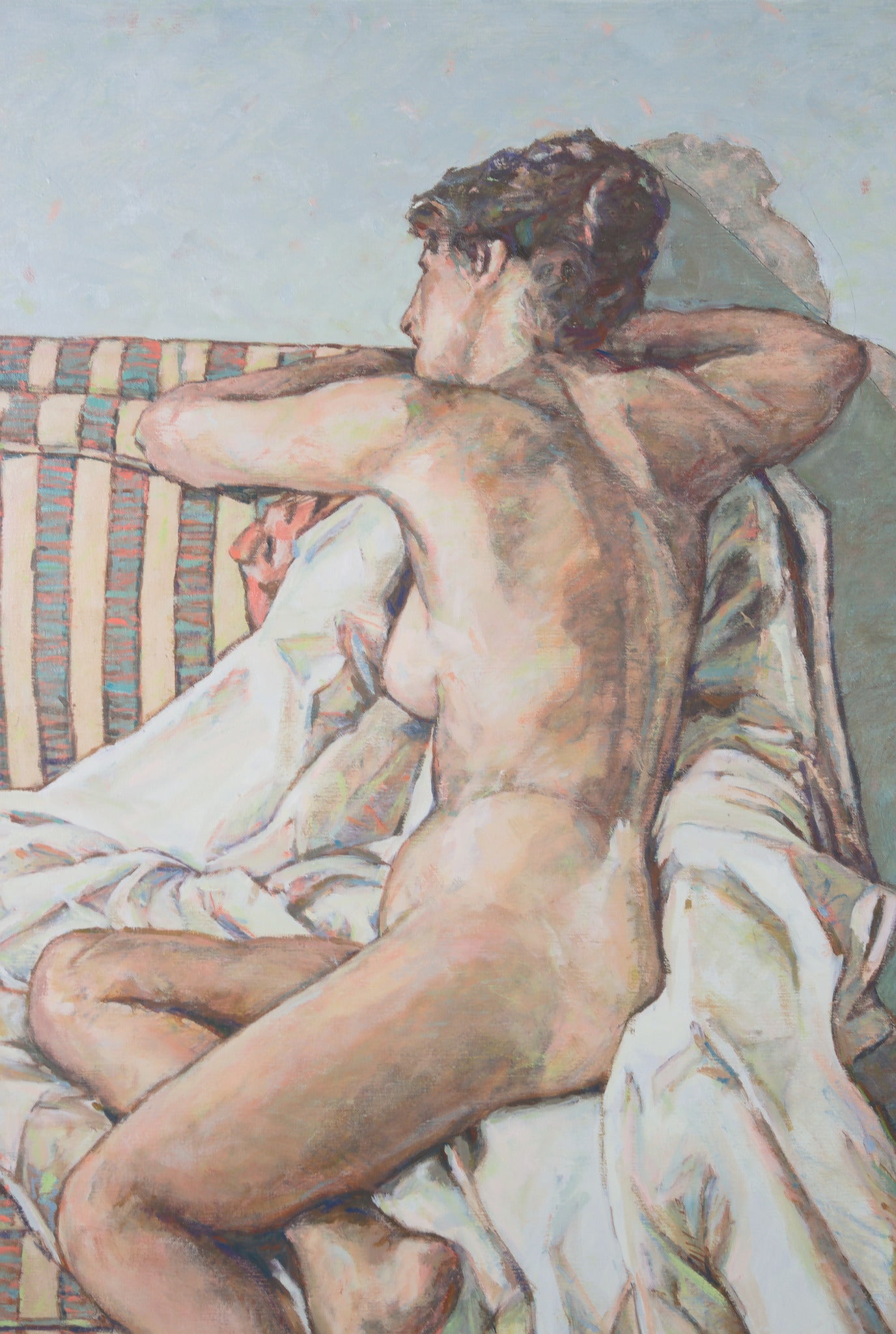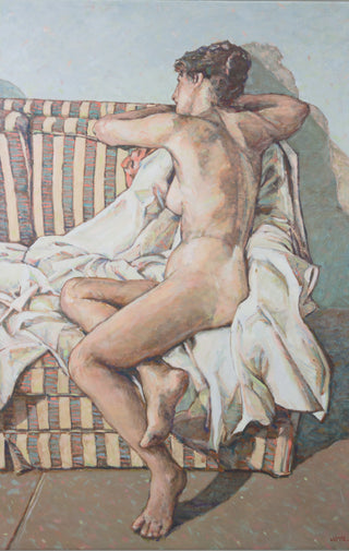 In ‘The Striped Chair’, Jarvis uses a subtle and neutrally-toned colour palette to render a contemplative study of her female subject. Through Jarvis’ eyes, the female body is not isolated, but is instead embedded within her surroundings. In softly-rendered angles, the body and blanket appear in visual harmony, with the striped couch quietly punctuation the sense of visual cohesion. Jarvis’s painting is tender and assured, a tonal study that connects the human body with its environment.