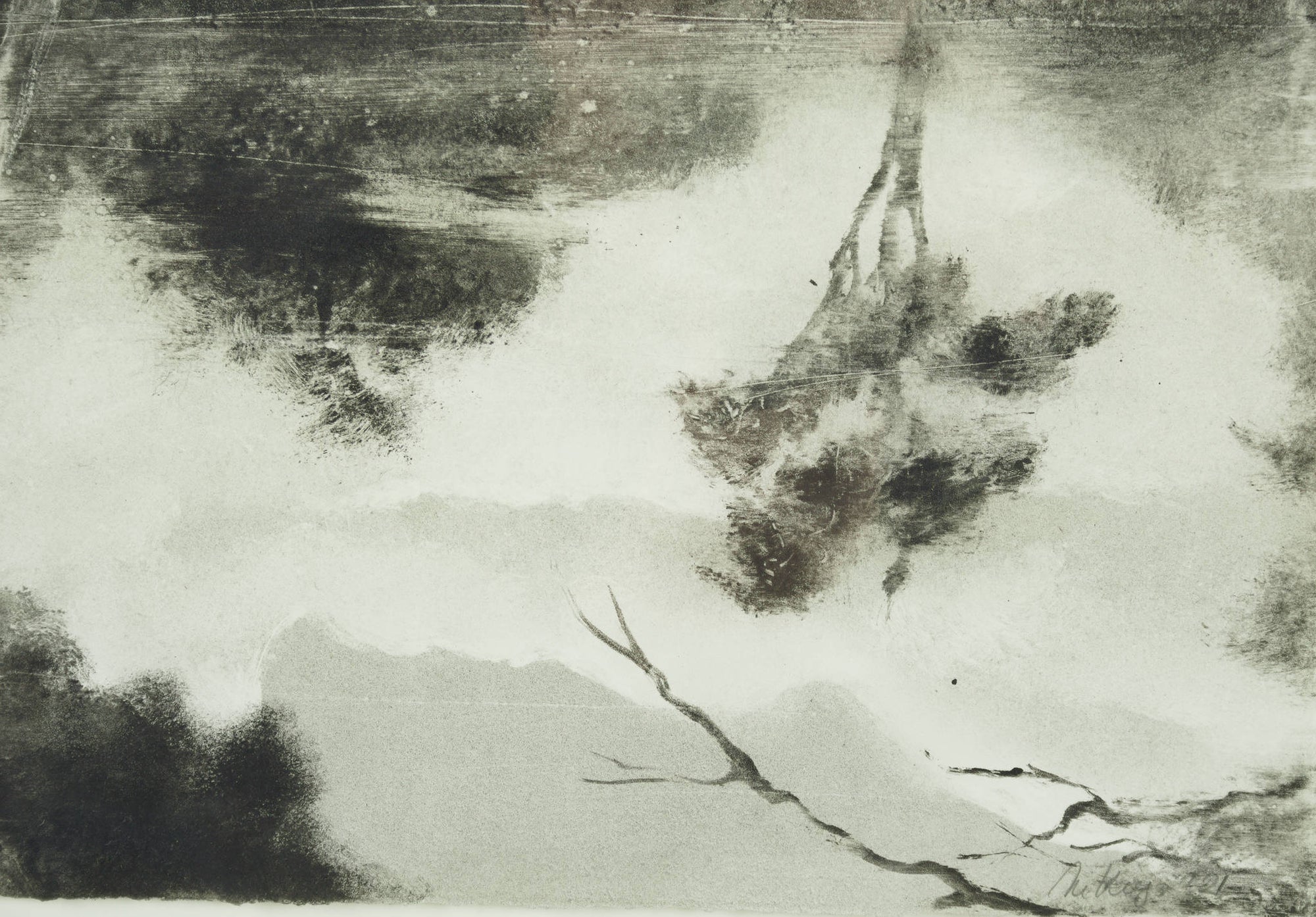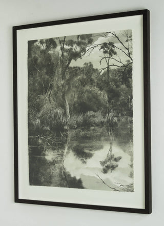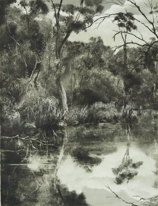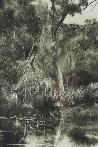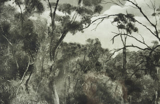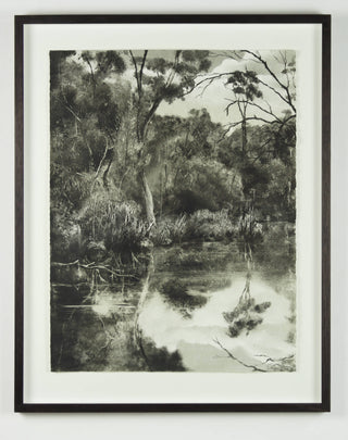 The monotype, ‘As above, so below,’ pictures an expressive snapshot of the Australian bush. Focusing on a river mirroring the trees and natural bushland above, Kemp captures the expressive quality of Australia’s natural terrain. As a monotype, this print is one-of-a-kind. Across her practice, Kemp insists upon the singularity of her prints, allowing each image to represent the unique products of the printmaking process. Within this print, Kemp invites contemplation, encouraging the viewer to engage with this work at their own pace.