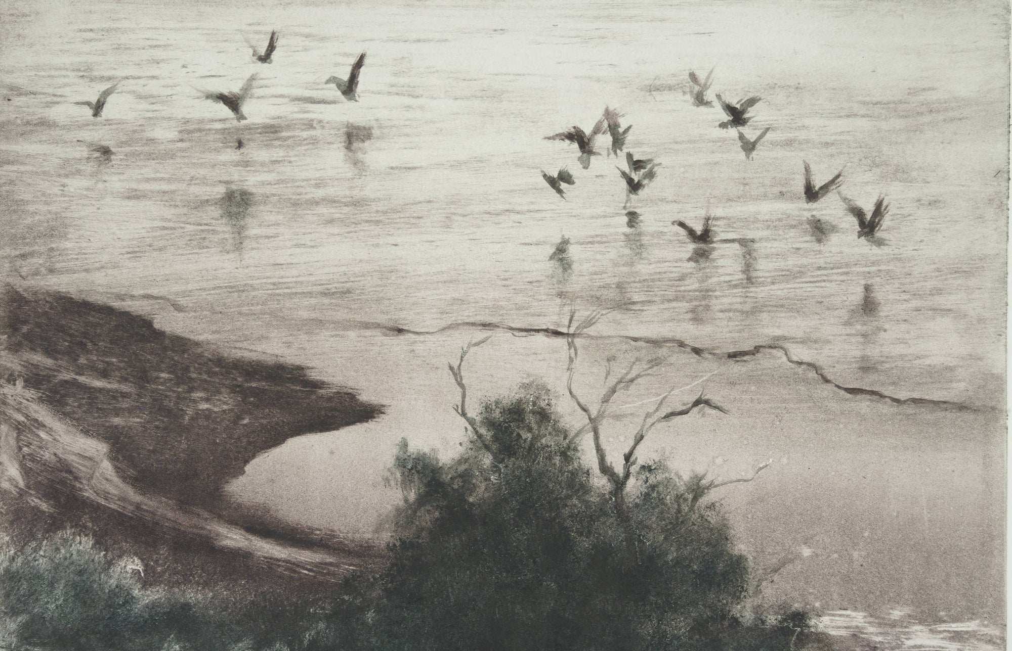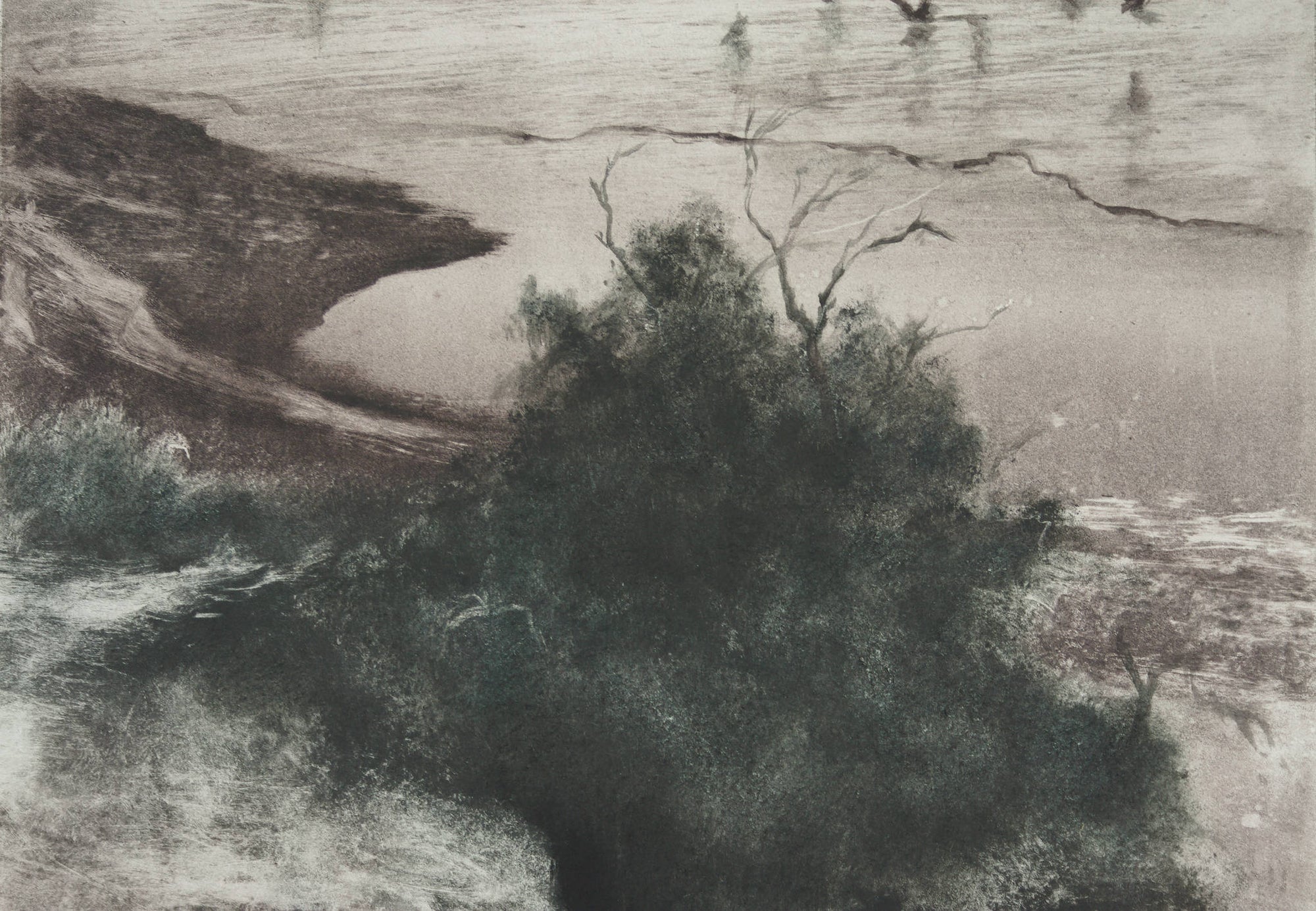 ‘In silence’ is an evocative monoprint picturing a coastal scene caught between surf and shore. Kemp masterfully divides the composition in half, with the top portion featuring birds flying along the sea and the bottom half composed of sand dunes and the plant life that grows upon them. This print bears the hazy quality of memory, rendered in soft detail and leaving a natural vignette around the image. This shoreline bears the traces of Australian wildlife, resonating with Kemp’s love of the outdoors.