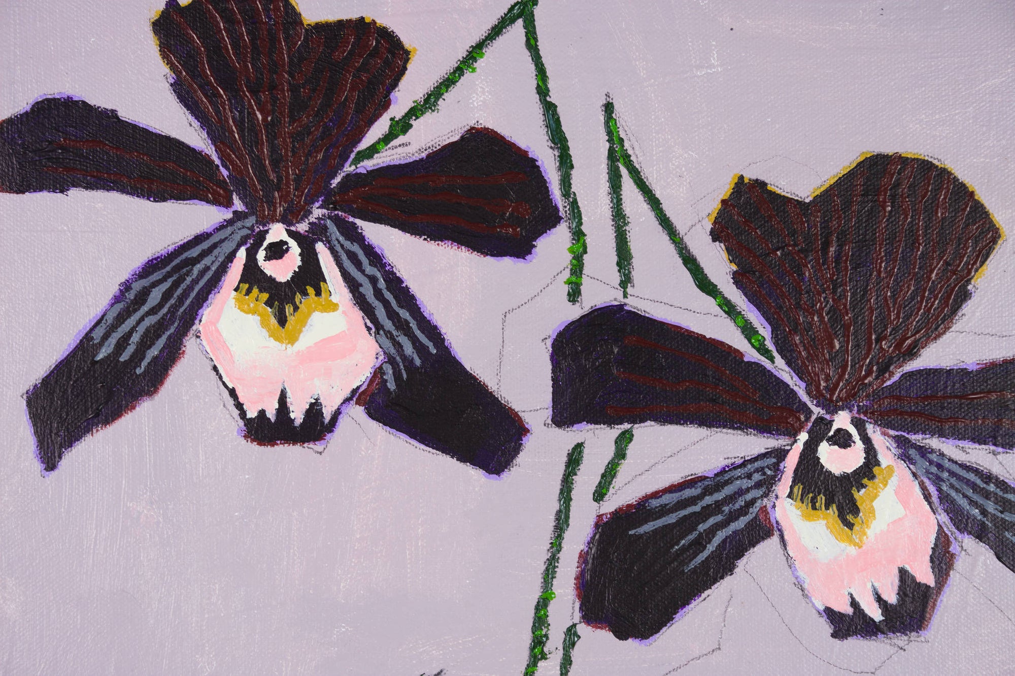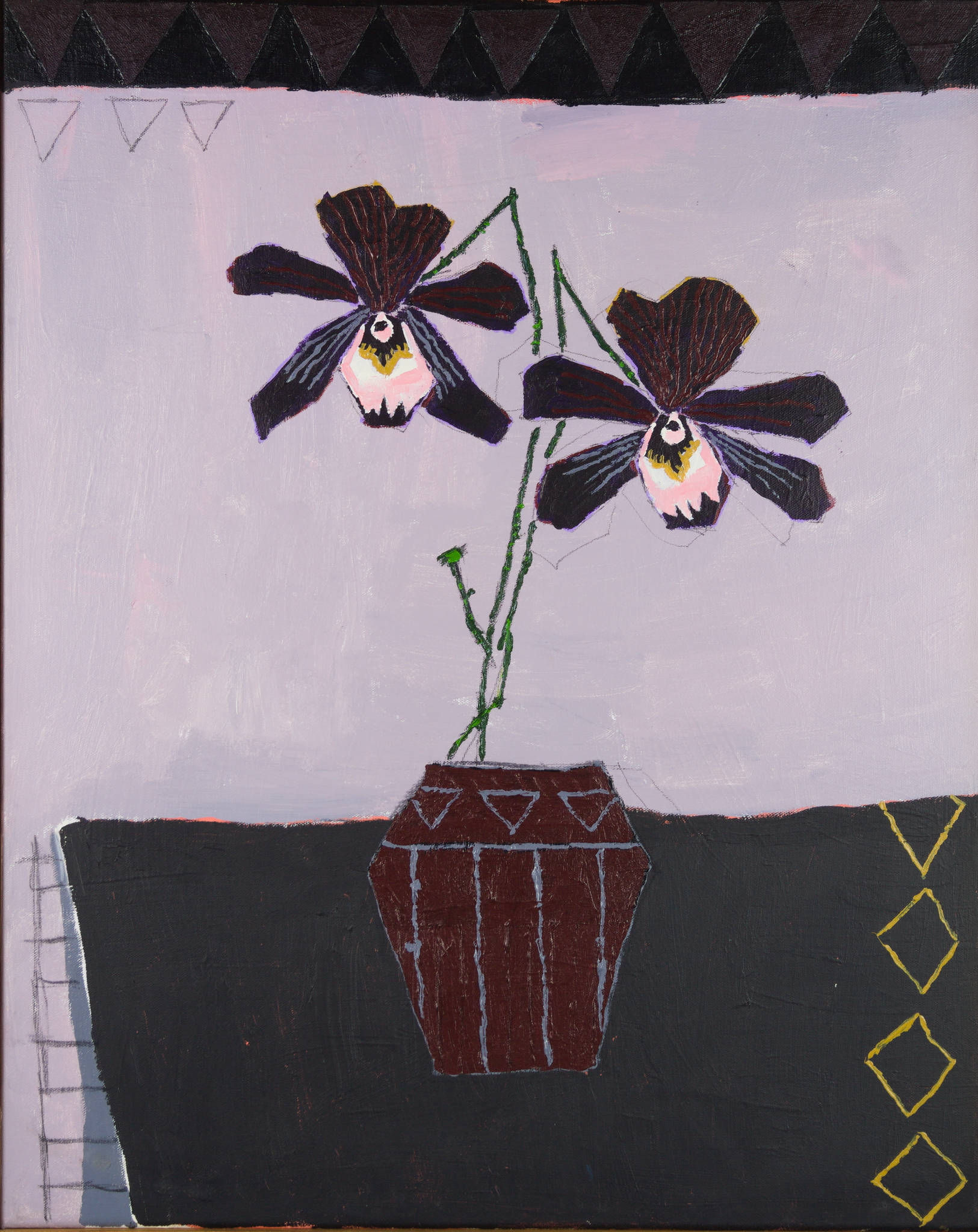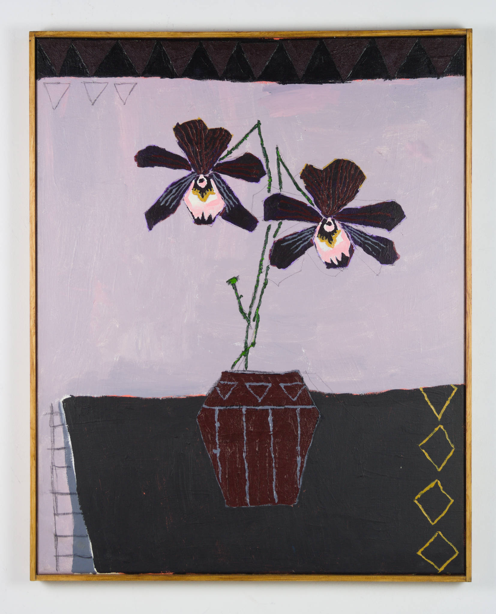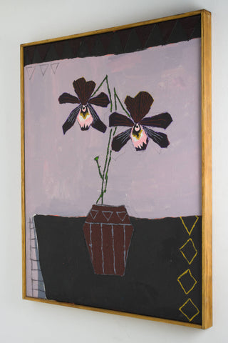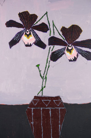 Against a muted background, Kerwick constructs a simple tablescape - two deeply-toned irises in a ceramic pot. In his signature artistic style, Kerwick combines graphic simplicity with bold and painterly mark-making, creating a scene is rich in contrast.