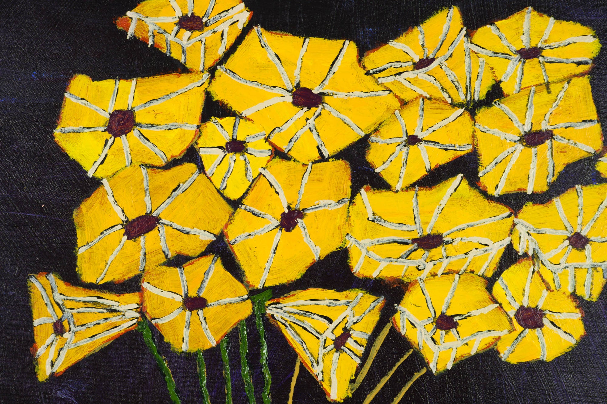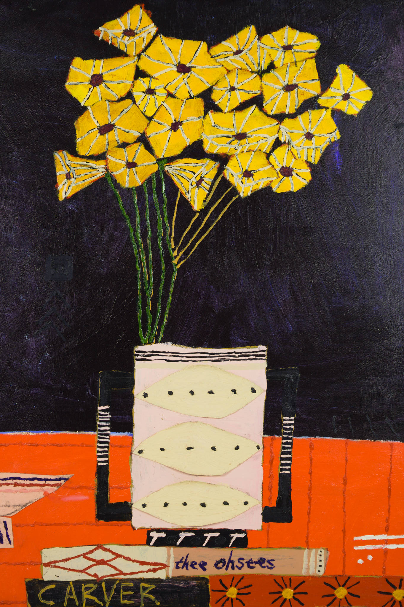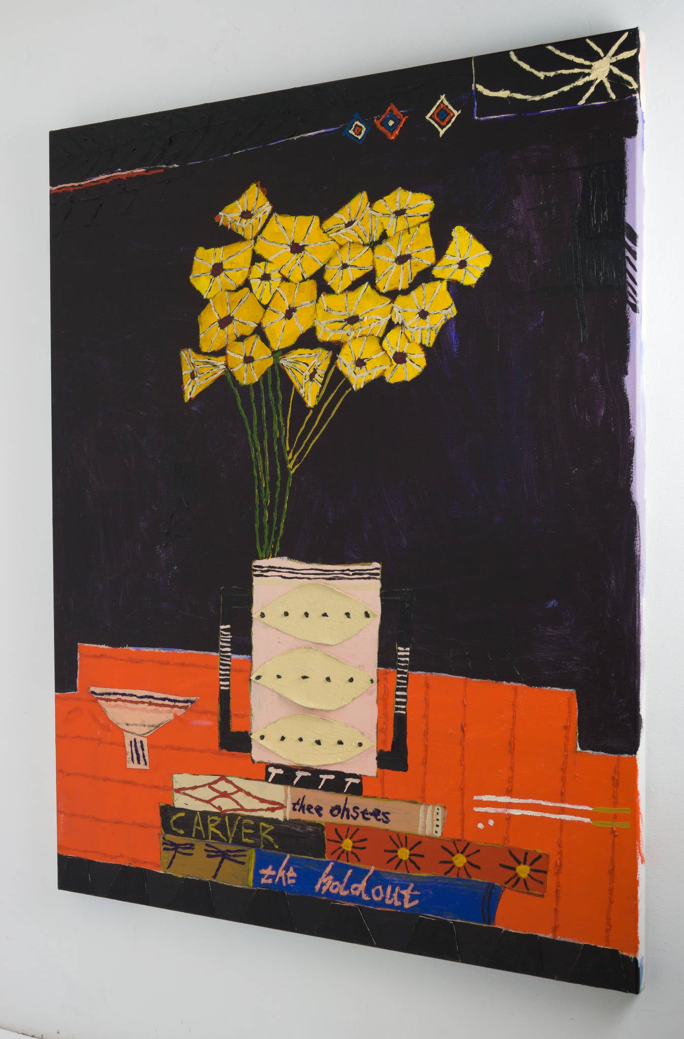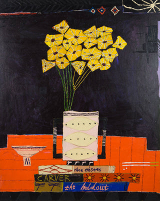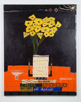 One of Kerwick's most celebrated subjects is that of still life flowers, and his 2019 painting 'Thee Oh Sees' is a testament to why this is. With bright yellow flowers appearing luminous against a deep navy blue background, Kerwick creates a scene that is rich in contrast. In his signature artistic style, Kerwick combines graphic simplicity with bold and painterly mark-making.