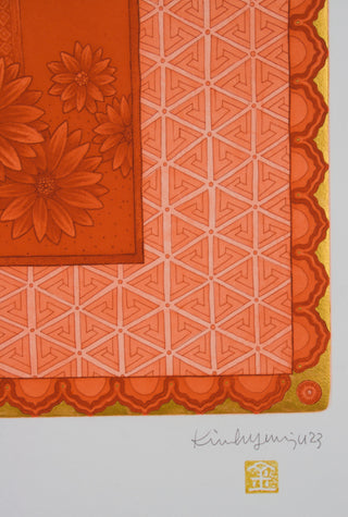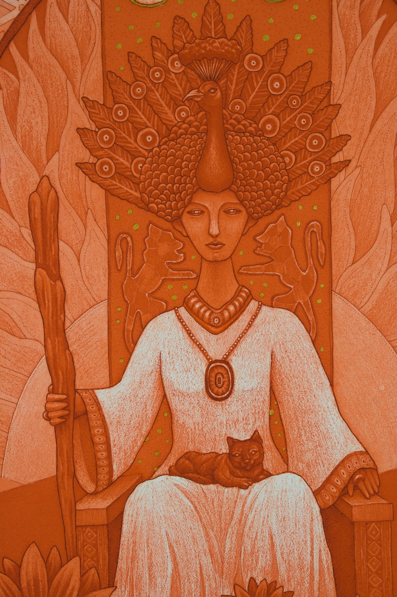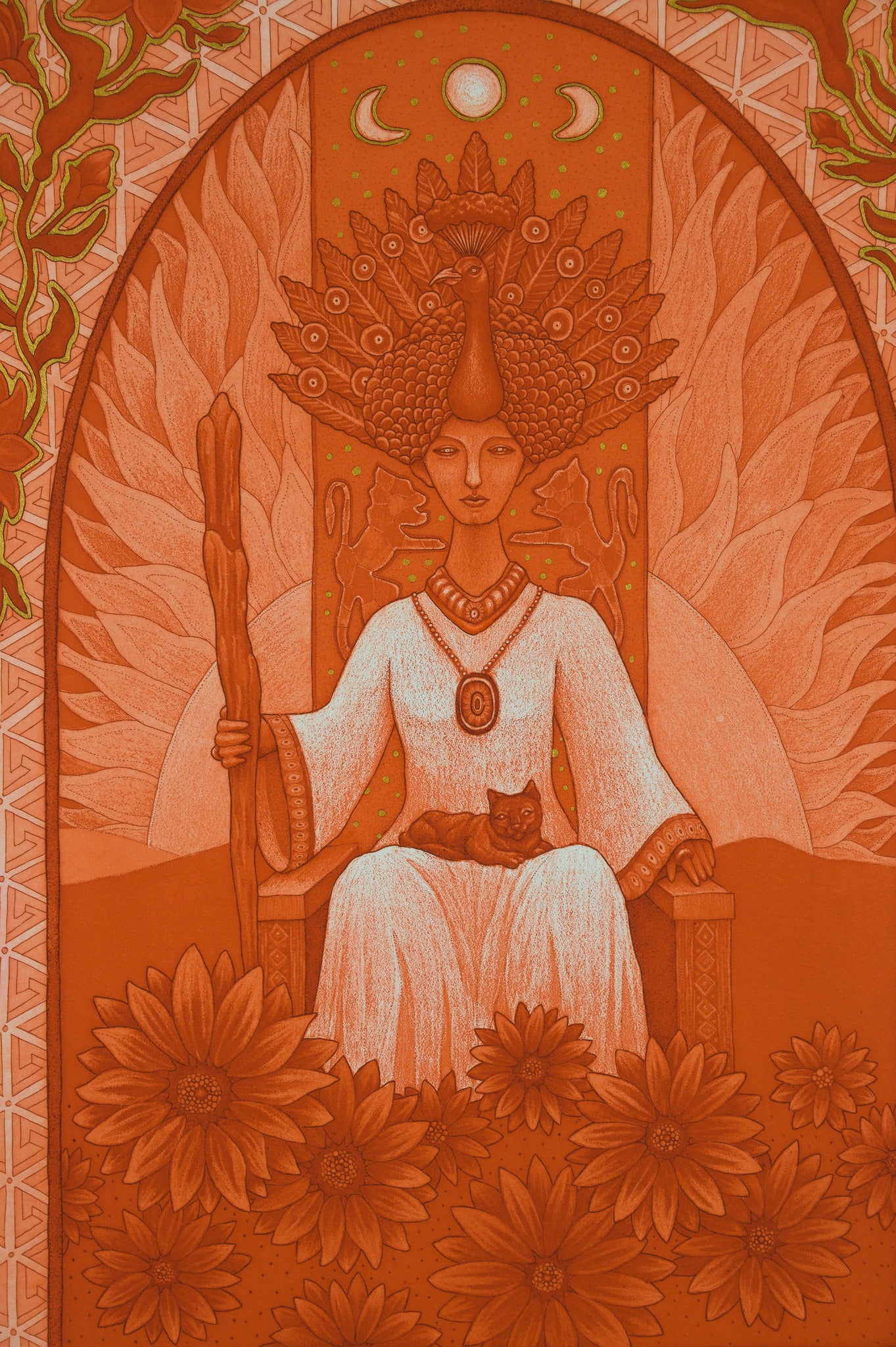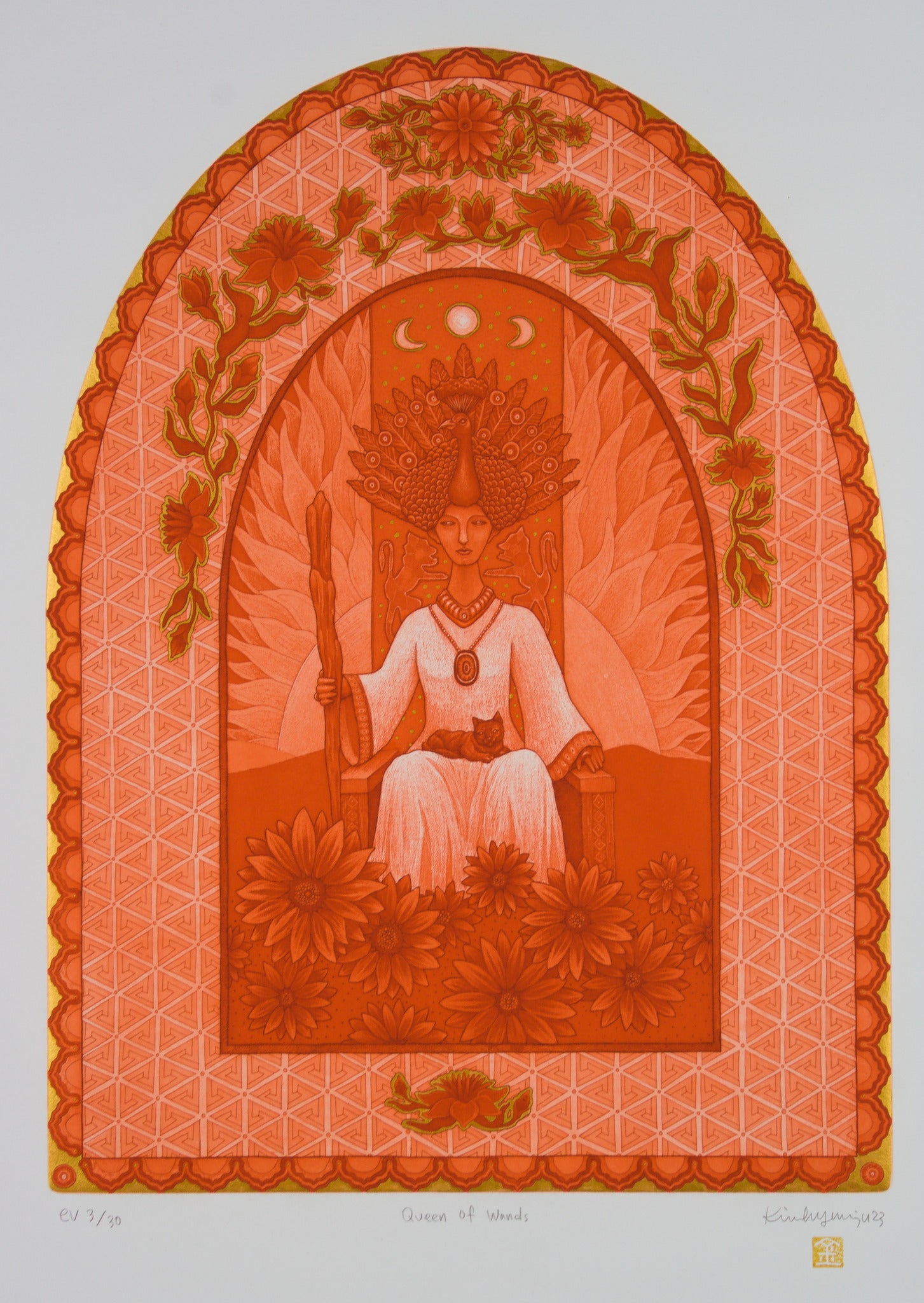 Through her work, Kim often draws influence from nature, culture, mythology and spiritualism. In her work ‘Queen of Wands’, this inspired sense of imagination is profoundly present. This particular etching belongs to her ‘tarot cards’ series - in the realm of tarot, the ‘Queen of Wands’ is a strong female protagonist, symbolic of charisma and authentic self-expression. In bright orange hues the imagined Queen is powerfully charged, radiating optimism and confidence.