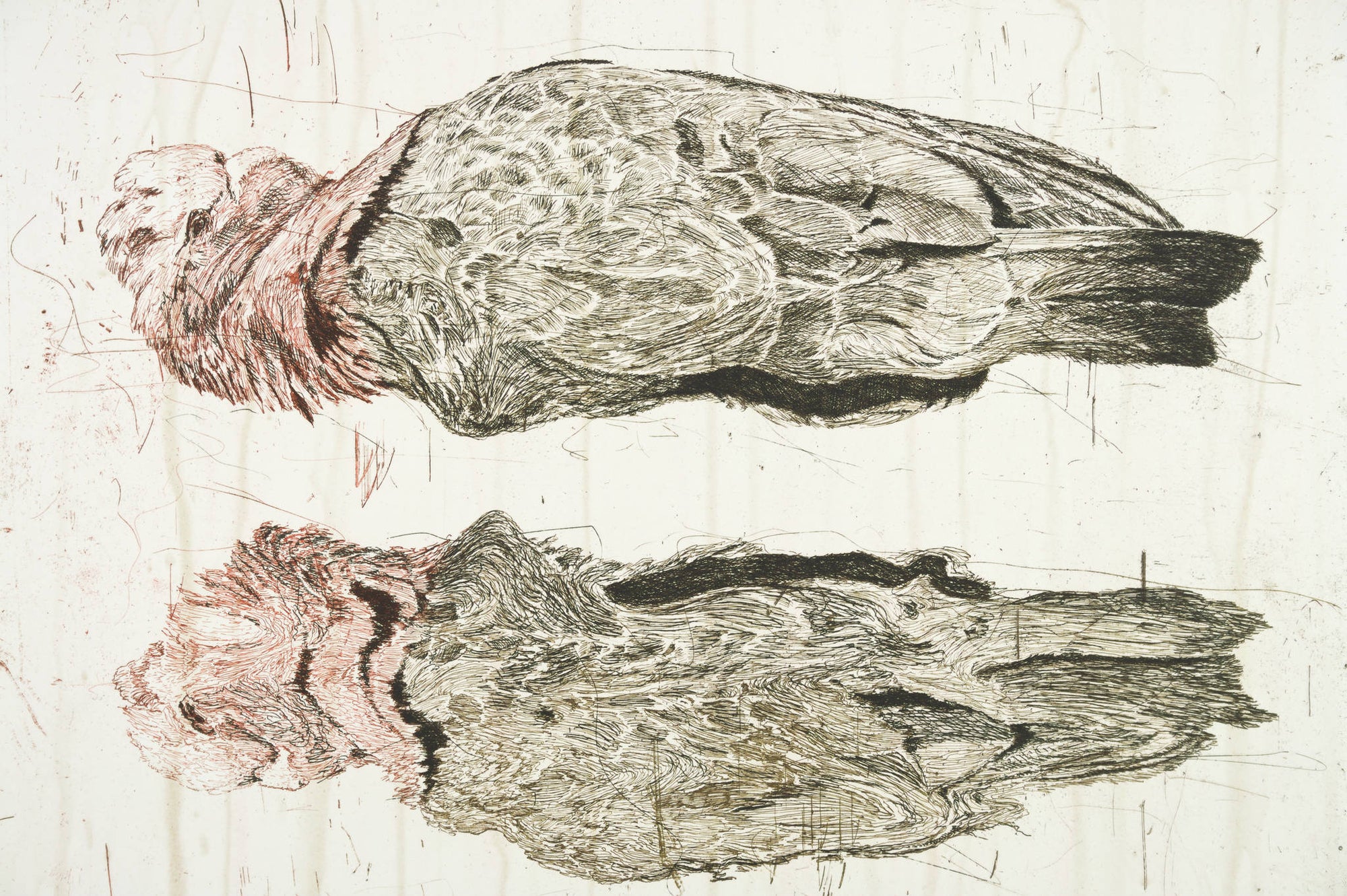 Birds recur throughout Martin King’s practice, crossing the domains of nature – sky, land and sea. In ‘mirage I’, they meet demise, pigment dripping like tears from their wings. Pinned in open space, King’s birds are suspended between life and death, at once divine in their ability to fly and endangered, as many species of Australian birds are. What does it mean to deny flight from a bird?