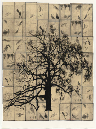 Martin King's 'Pages from the Diary of Lost Souls' offers a poignant meditation on the concept of the Tree of Life. The skeletal nature of the tree presents a stark irony - symbolizing not flourishing growth, but loss or absence. Scattered across and around the tree are the silhouettes of birds, haphazardly placed. Often they are not perched on branches, nor do they possess wingspans to suggest flight, creating a visual dissonance that evokes suspension, dislocation, or loss. Each bird is rendered in a solid, uniform tone, stripped of internal detail, which obscures species and identity. In doing so, King transforms them into graphic emblems: symbols of motion, memory, and absence.