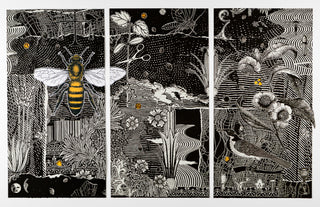 Kitchener’s 2021 linocut with collage, “Seed totem II” features three panels of miscellaneous natural imagery. Focusing on a large bee spanning the first two panels, this print is filled with images of birds, flowers, plant life and patterns that evoke waterways. This evocative work incorporates imagery from Kitchener’s surroundings, reflecting upon nature as one of her greatest creative inspirations. This print is rich in detail, prompting greater delight with every interaction with the work.