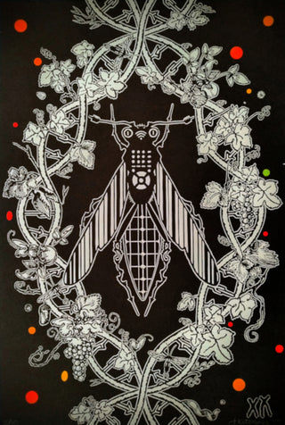 Kitchener’s 2015 linocut with collage, “Wasp Drone: autumn,” pictures a wasp surrounded by a wreath of flowers and vines. This wasp is patterned with stripes and squares, creating a tone of whimsy, especially when set against multi-coloured circles emerging from the background. This print evokes the changes brought by autumnal weather, celebrating the rewards brought by the appearance of seasonal flora and fauna. This print acts as a joyful reminder of natural patterns, emphasising the bigger picture.