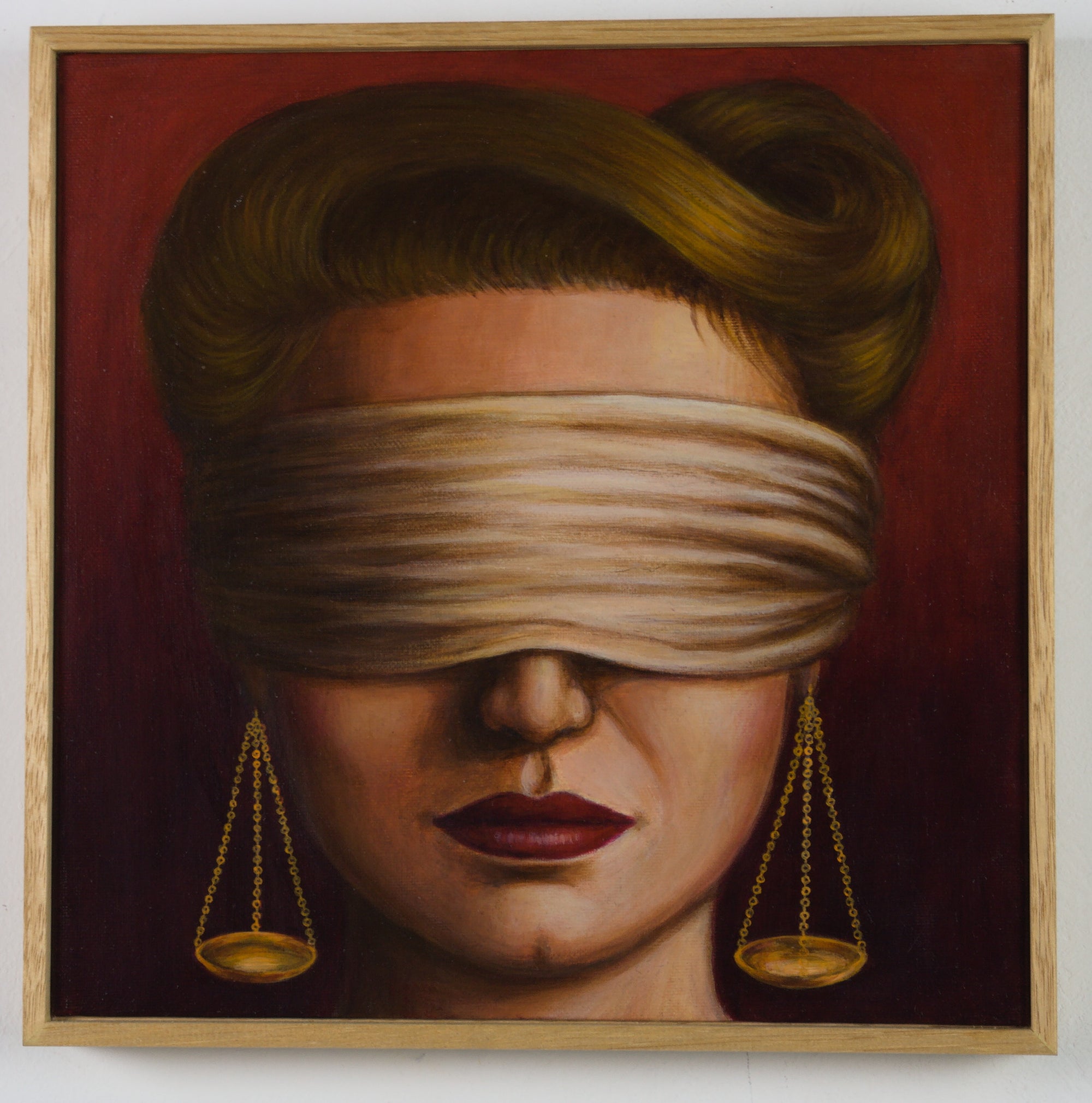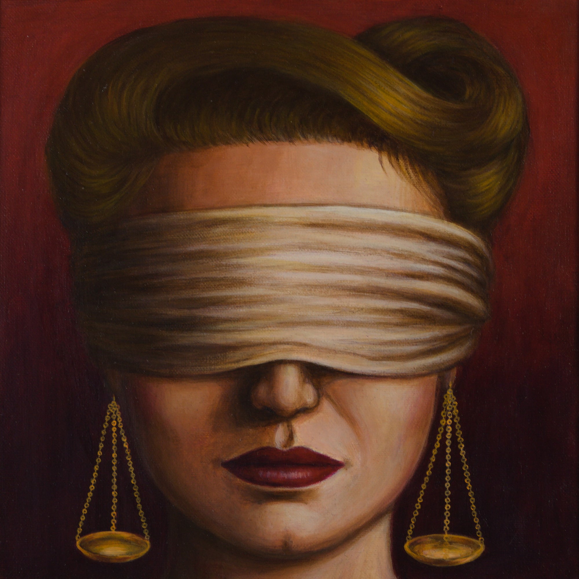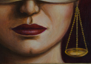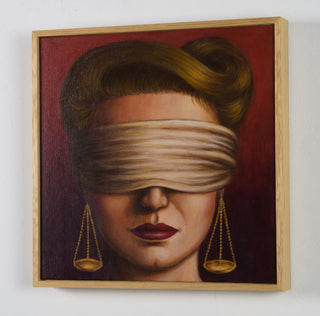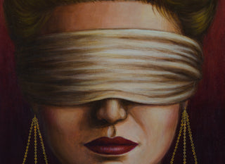 In Klein’s 2024 painting 'Lady Justice', the central figure is charged with symbolic intensity. A blindfold obscures the subject’s eyes, while the balancing scales of justice appear as earrings, transforming a familiar emblem into a personal adornment. In her characteristic manner, Klein fuses powerful female iconography with long-standing societal expectations surrounding women’s beauty and presentation. The resulting portrait is rich with tension - simultaneously asserting authority while suggesting the constraints historically imposed upon women.