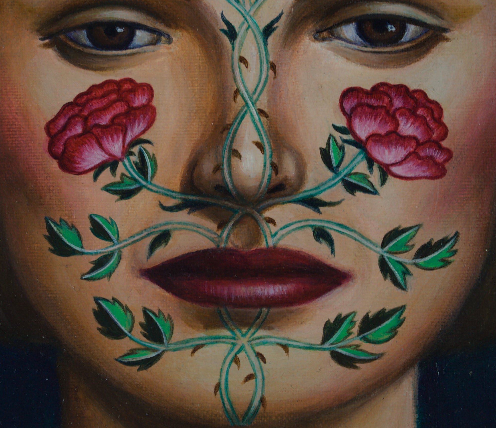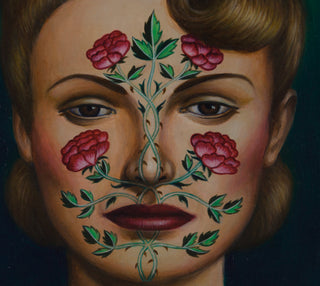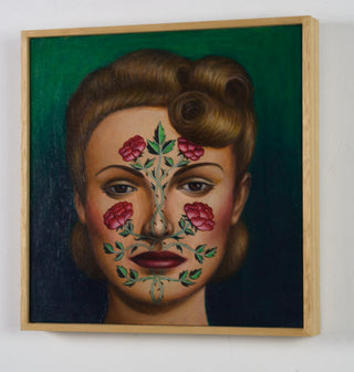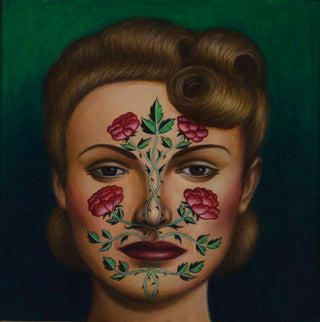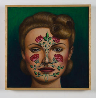 In her 2024 painting 'Rose Arbour', concealment takes the form of delicately rendered roses that trail across the subject’s face, both decorating and masking her features. The roses reference the designs of May Morris, the daughter of William Morris. May Morris was a significant advocate for women’s creative recognition, founding the Women’s Guild of Arts in 1907 in response to the exclusion of women from the Art Workers’ Guild. In characteristic fashion, Klein uses her carefully composed portrait to invoke women’s histories, drawing attention to narratives that have often been overlooked.